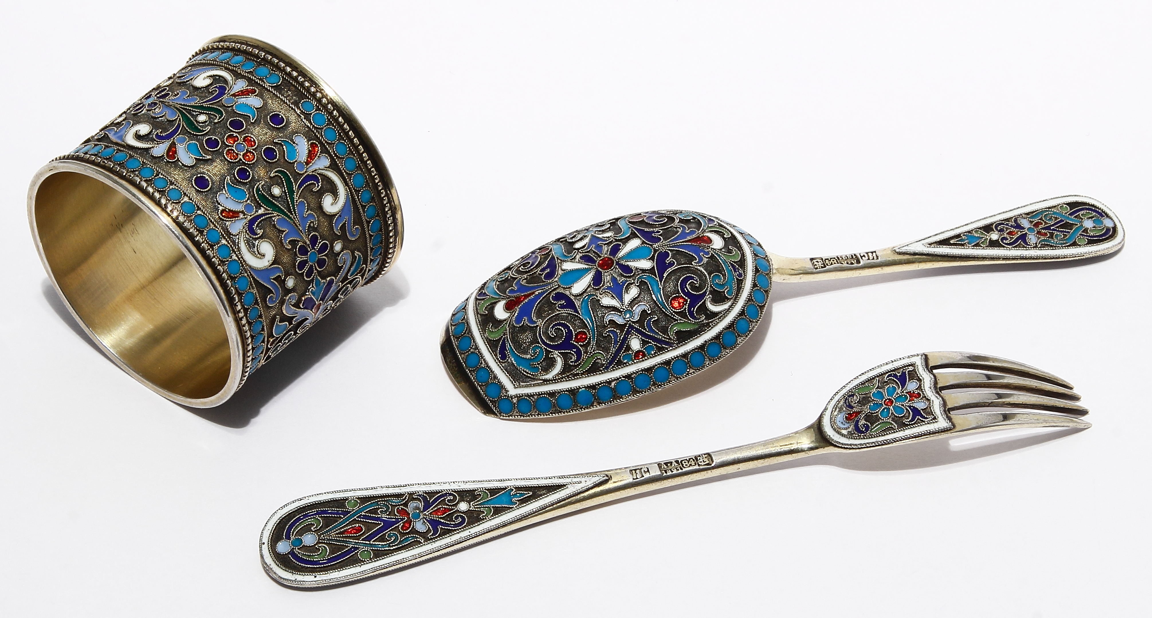 Совочек, вилка, кольцо. Серебро, скань, эмаль.