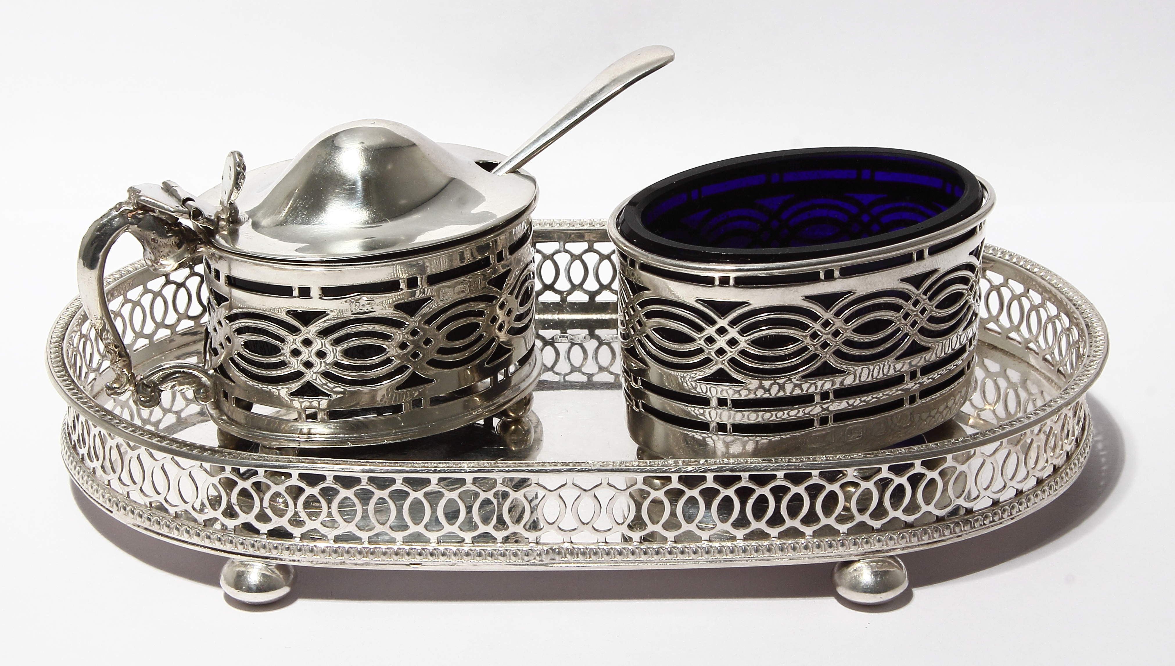 |  | длина чаши - 5,5см, ширина - 4,1см, высота по крышечку - 4,5см. Ложечка: длина - 8,3см Подставка: длина - 16,5см, ширина - 9см, высота - 2см. Общий вес изделий (без стеклянных вставок) - 217 граммов серебра 925 пробы.