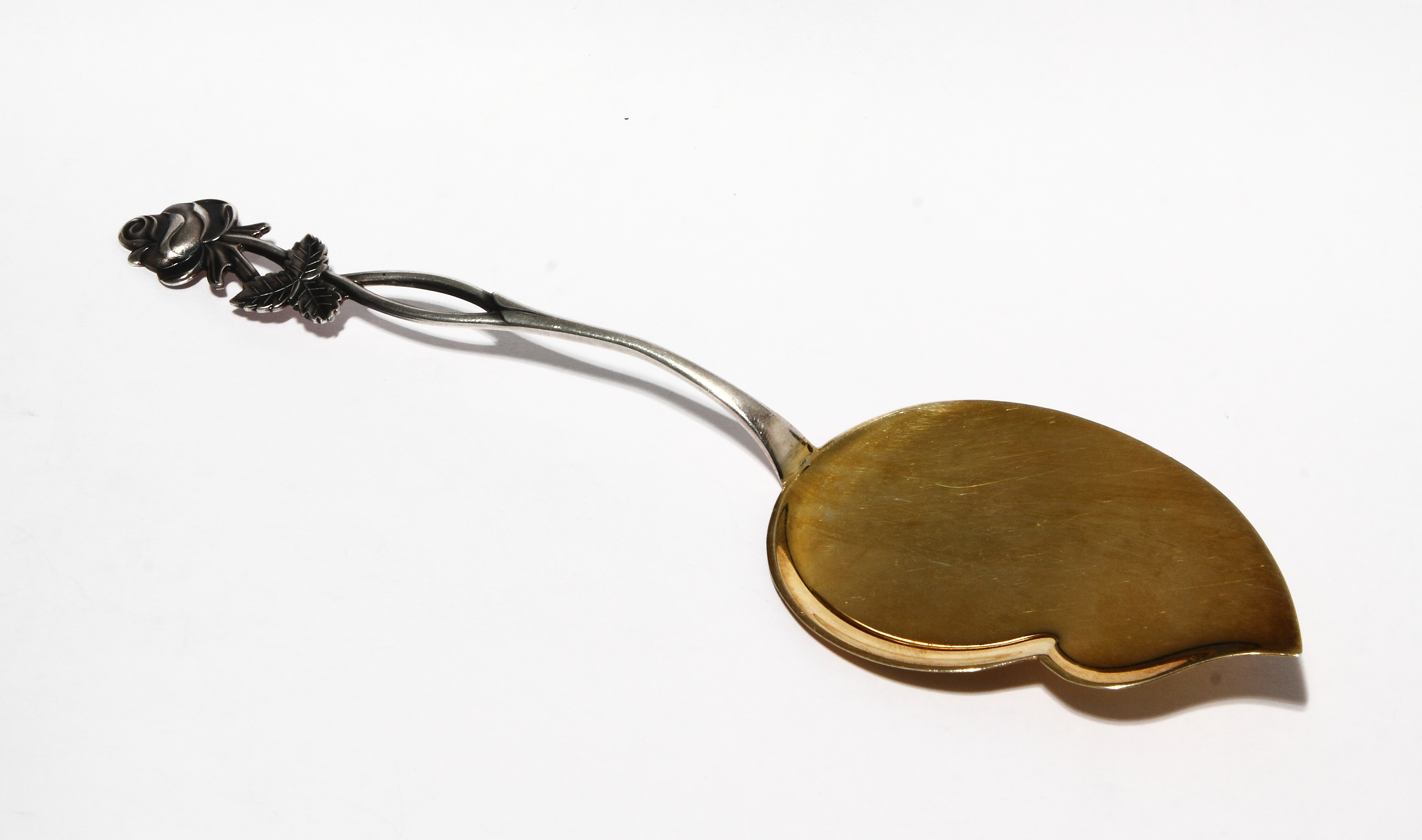 В данном лоте предлагается серебряная сервировочная лопатка, выполненная в дизайне"Хильдесхаймская роза". абочая часть лопатки позолочена.Финляндия, середина 20 века.Длина - 19 см.Вес - 29 граммов серебра 813 пробы.Без гравировок.Без вмятин, крупных царапин и иных существенных повреждений.Состояние смотрите на фотографиях. Если Вам что-то не видно на фотографиях, напишите,воспользовавшись опцией "Обсудить лот", выложу более подробные фотографии.