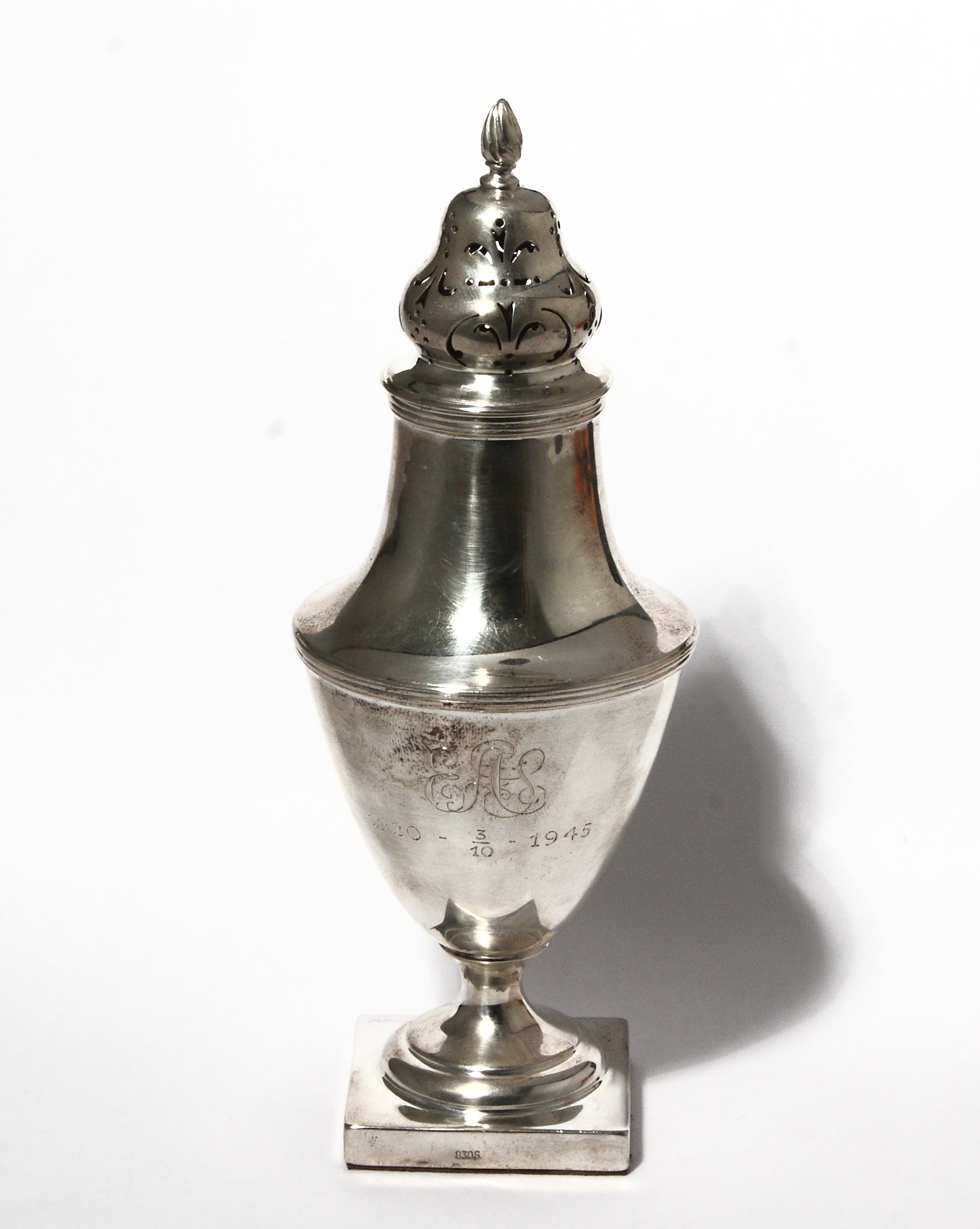 На тулове стоят пробирные клейма Англии:Пробирные клейма Англии: "Идущий лев" подтверждает, что изделие произведено в Англии из серебра 925 пробы. "Три снопа" - клеймо пробирной палаты города Честер. Буква "L" сообщает о том, что изделие было апробировано в 1912 году. На основании имеется цифровое клеймо "830S", удостоверяющее 830 пробу серебра. В описании данного лота представлены лишь краткие сведения о нем. Если Вы действительно заинтересованы в покупке этого лота и не можете найти важной для Вас информации, дополнительных фотографий, размеров, описания клейм, Вы всегда можете запросить эту информацию через форму обсуждения лота - "задать вопрос продавцу".