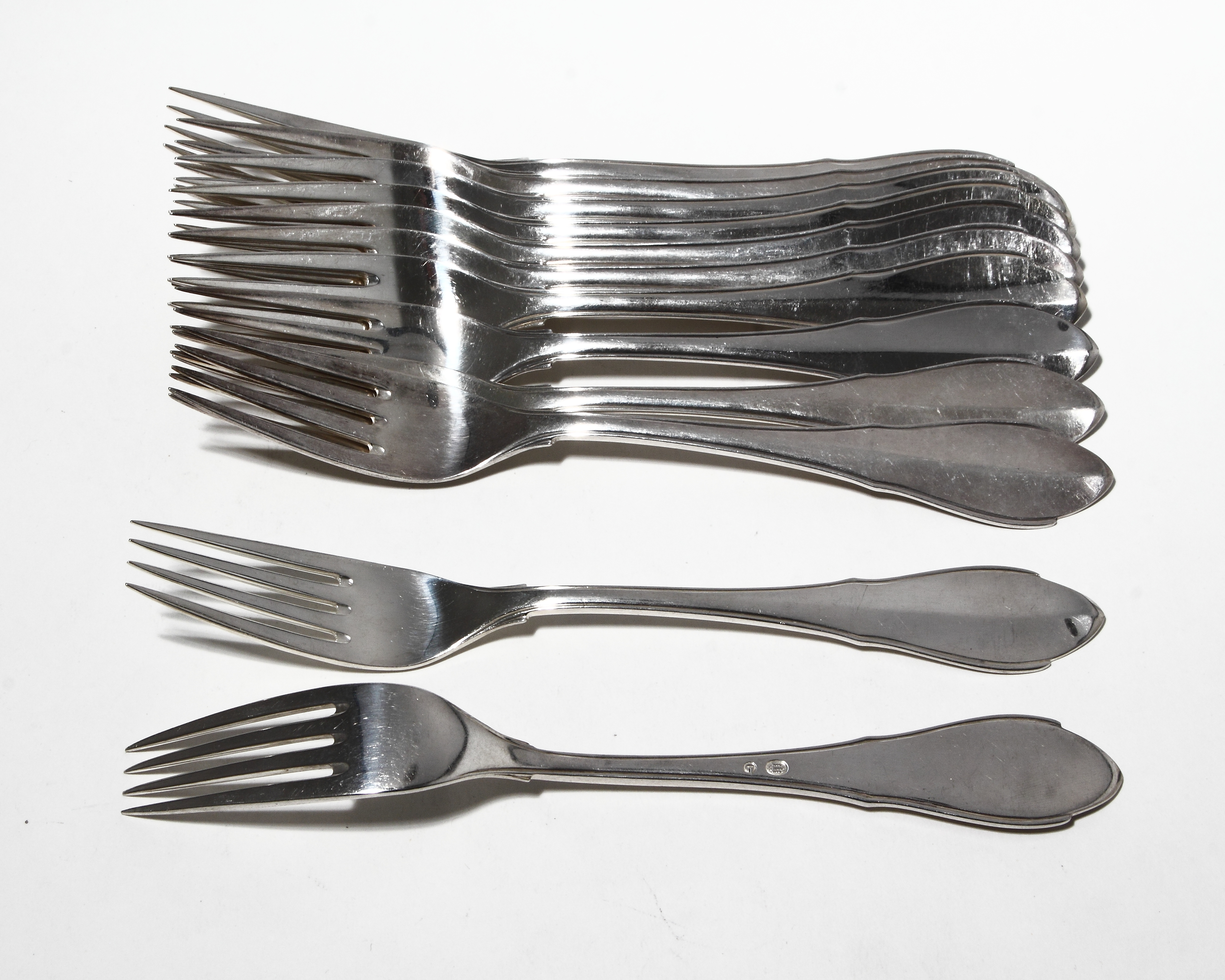 В данном лоте предлагается двенадцать серебряных обеденных вилок, выполненных в дизайне "Fabricius".