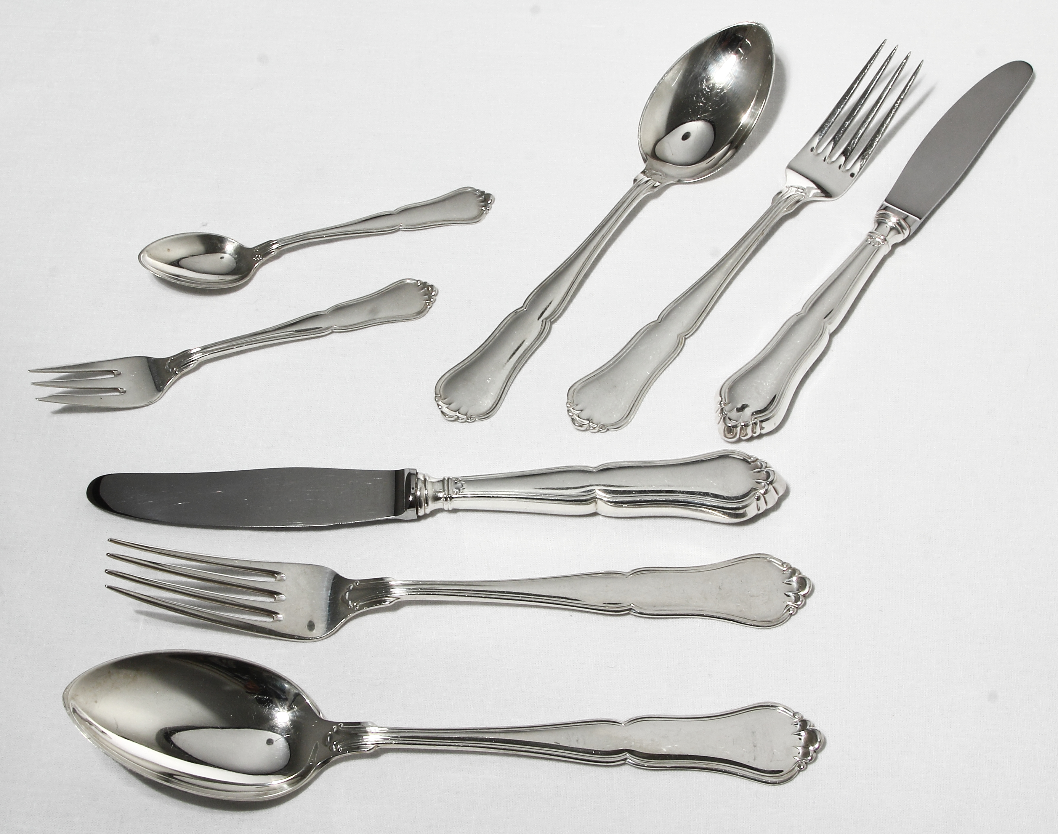На приборах имеется клеймо мастерской (кроме ножей), а также датское пробирное клеймо для