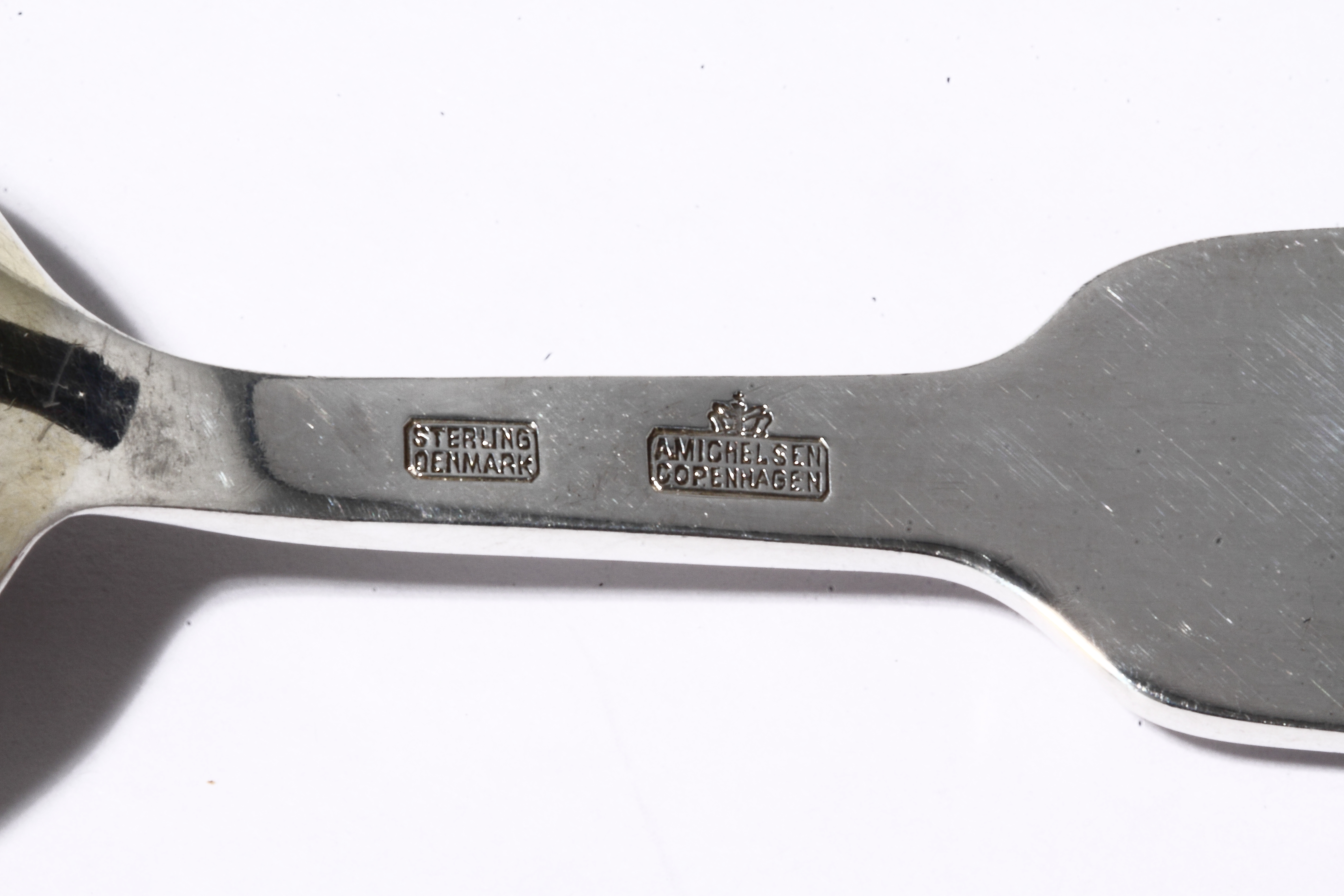 десертная ложка 1950 года - "Зимний лес" ("Winter Forest"), из годовой серии от Anton Michelsen. учка ложки декорирован эмалевыми зелеными елками с белыми звездочками на макушках. Дания, г.Копенгаген, A.MICHELSEN, 1950 год. Длина - 16см. Вес- 46 граммов серебра 925 пробы. С 1910 года именитый датский производитель столового серебра A.Michelsen выпускает каждый год так называемую Christmas Spoon, которую традиционно датчане, да и не только, включают в рождественские подарки близким. Авторами дизайна становятся наиболее интересные датские дизайнеры, художники, скульпторы. В данном случае дизайн изделий был разработан Poul Høyrup. На изделии имеются клейма "A.MICHELSEN COPENGAGEN" и "STERLING DANMARK" - клеймо известного датского производителя серебряных изделий, поставщика королевского двора, и клеймо, удостоверяющее, что изделие произведено в Дании из стерлингового серебра (925 проба). Без гравировок. Без вмятин, крупных царапин и иных существенных повреждений. Состояние смотрите на фотографиях. Если Вам что-то не видно на фотографиях, напишите, воспользовавшись опцией "Обсудить лот", выложу более подробные фотографии.  Кликнув по ниже указанным картинкам, Вы сможете рассмотреть лот на более качественных фотографиях, чем это позволяет сделать "Молоток":