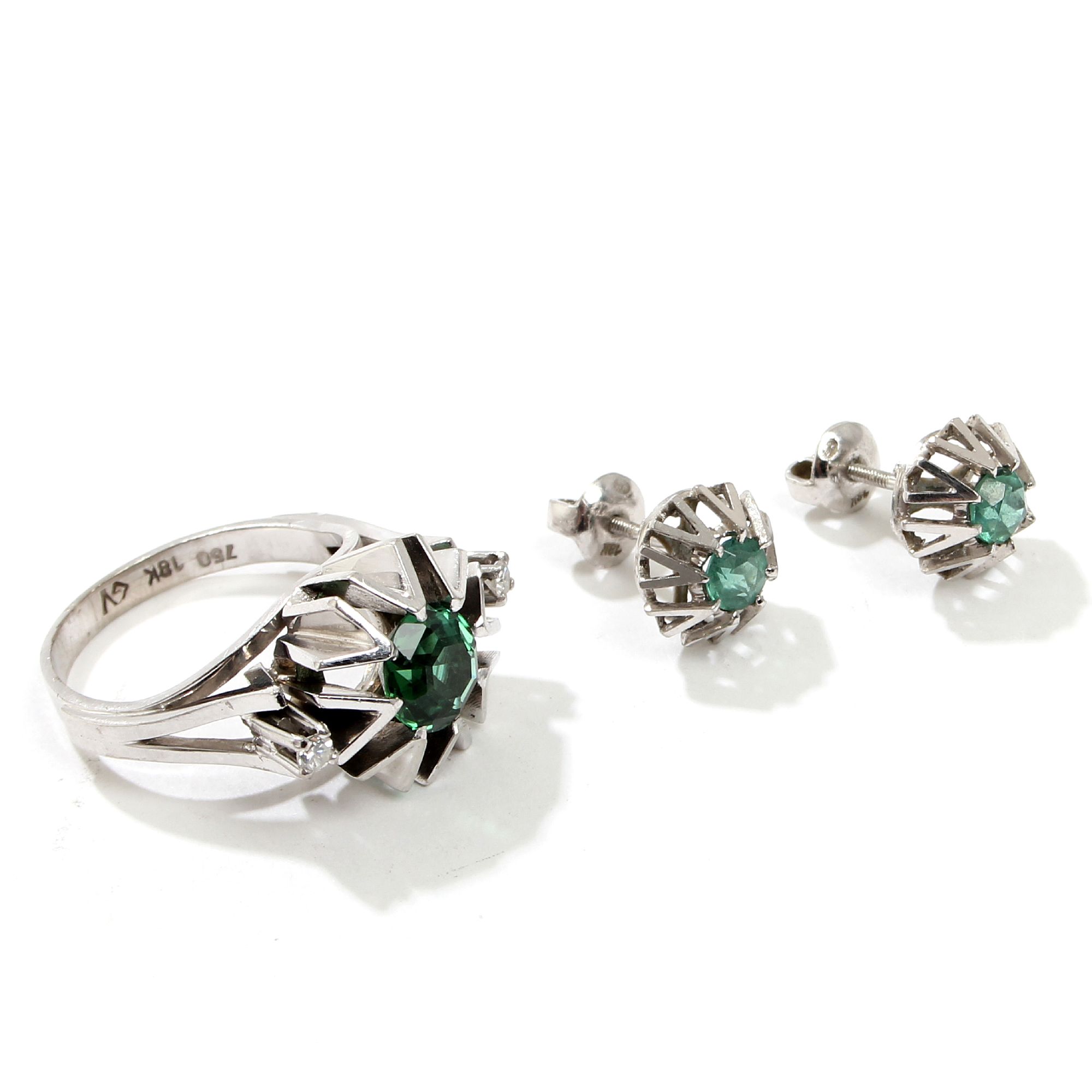 В данном лоте предлагаются кольцо и серьги из белого золота с ярко-зелеными вставками.