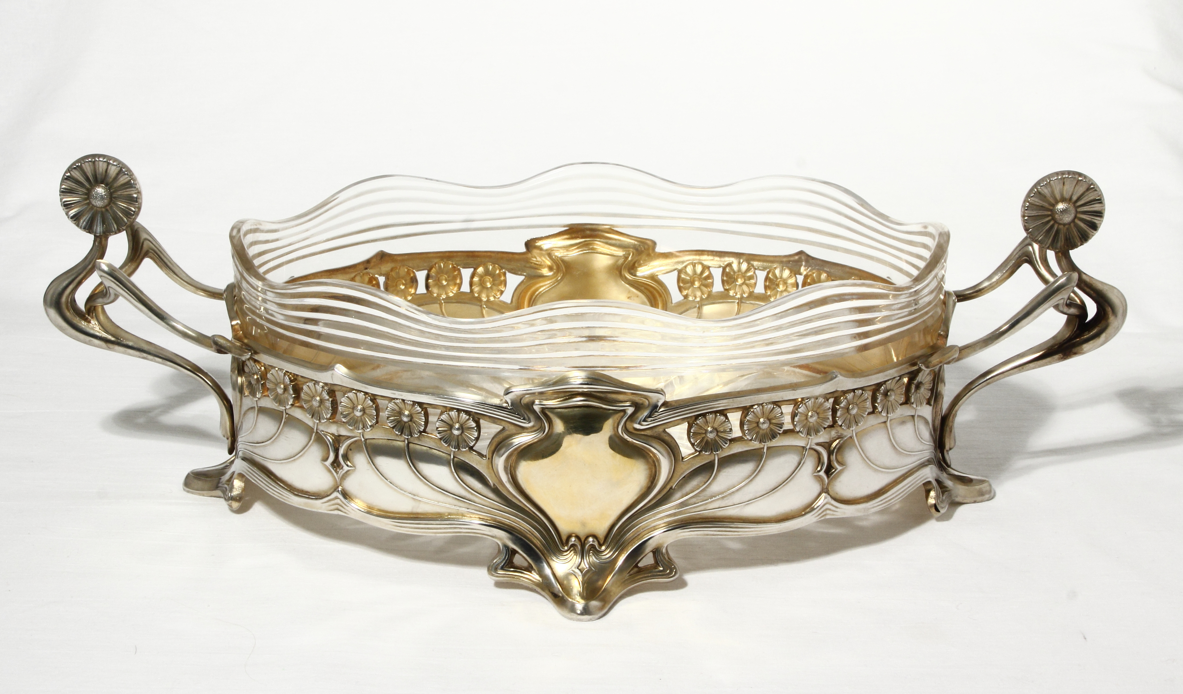 Большая стеклянная ваза вставлена в красивое прорезное обрамление, выполненное из серебра.