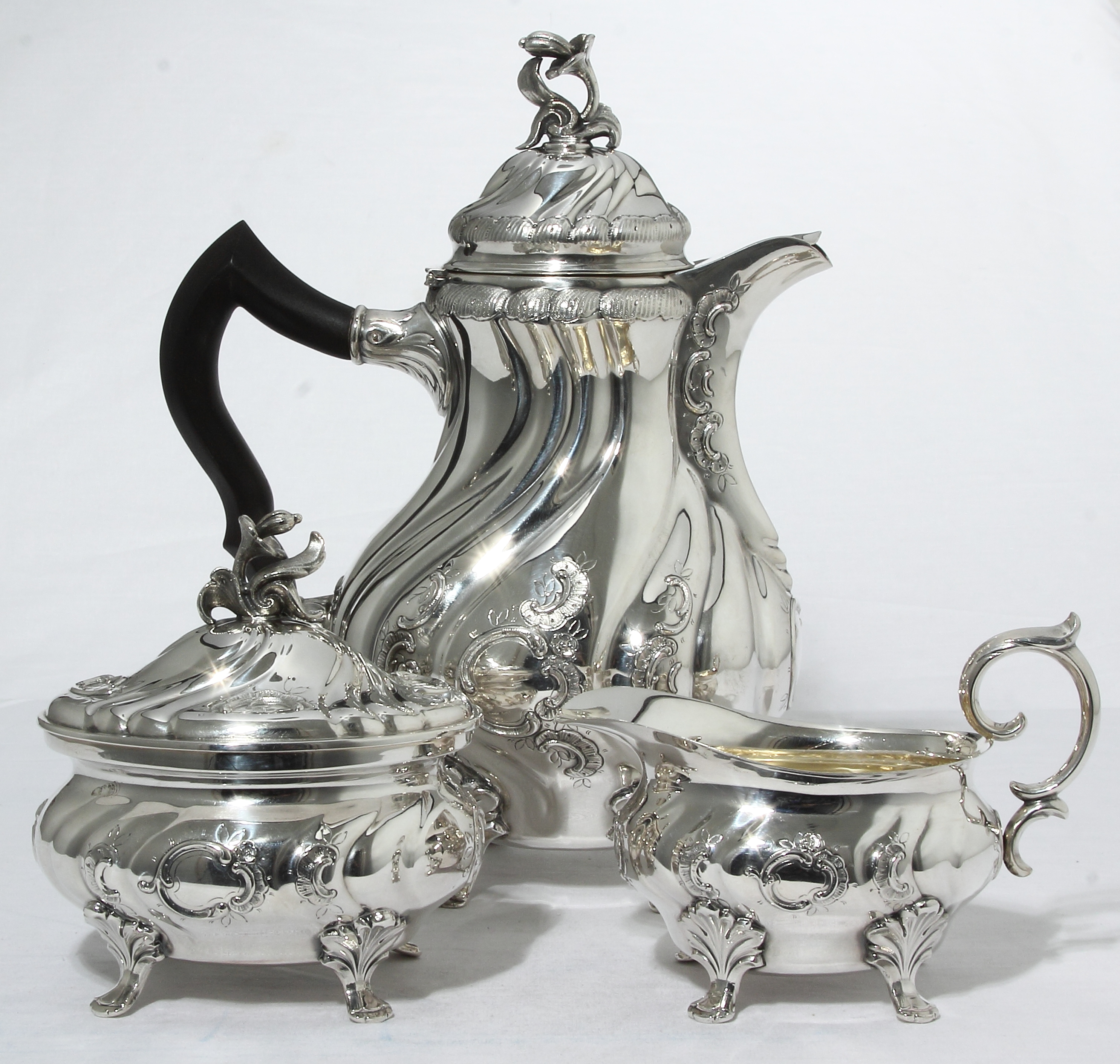 Красивый серебряный кофейный сервиз, 3 предмета.