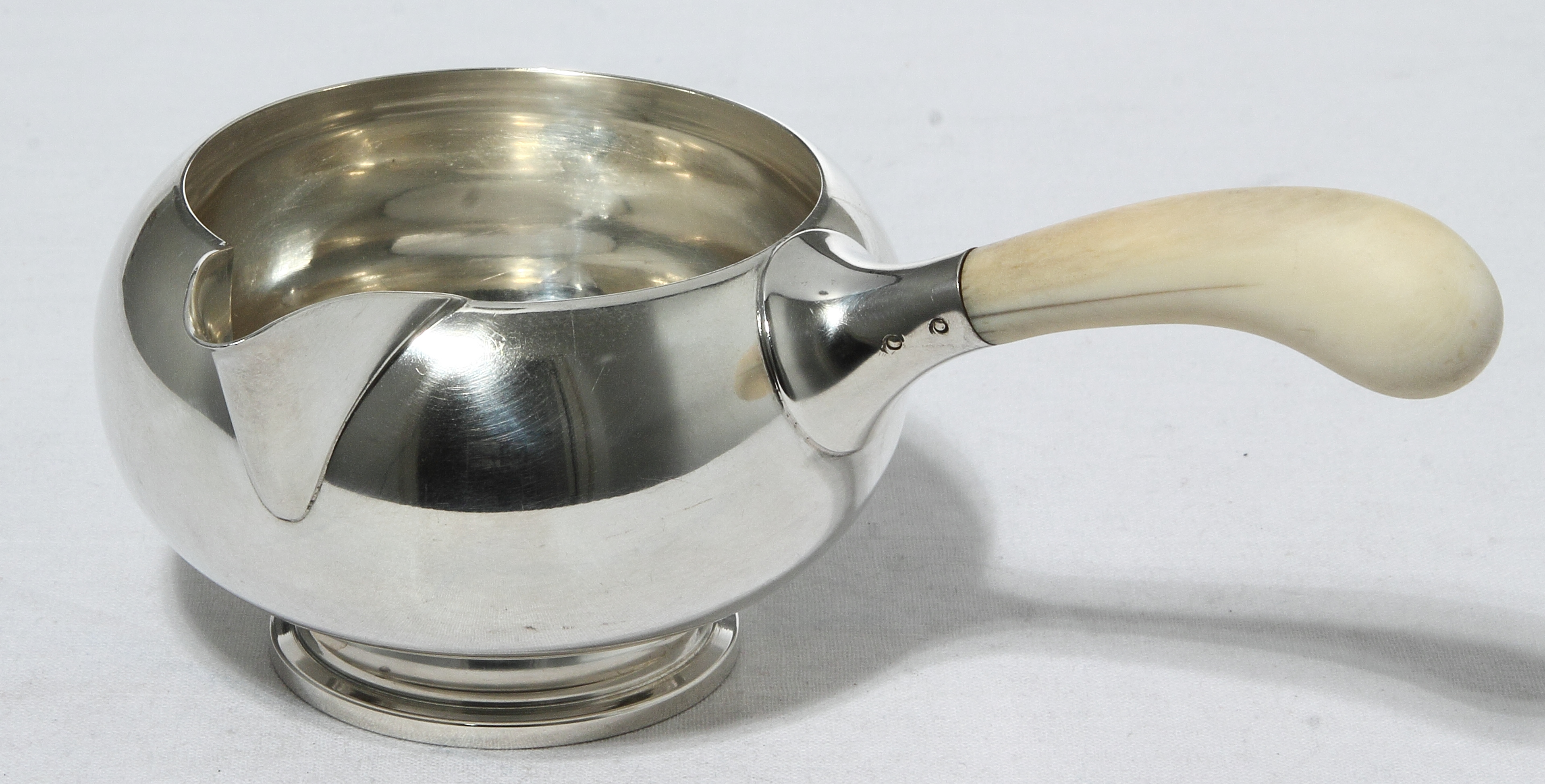 В данном лоте предлагается массивный серебряный соусник в виде ковшика с ручкойиз натуральной кости.