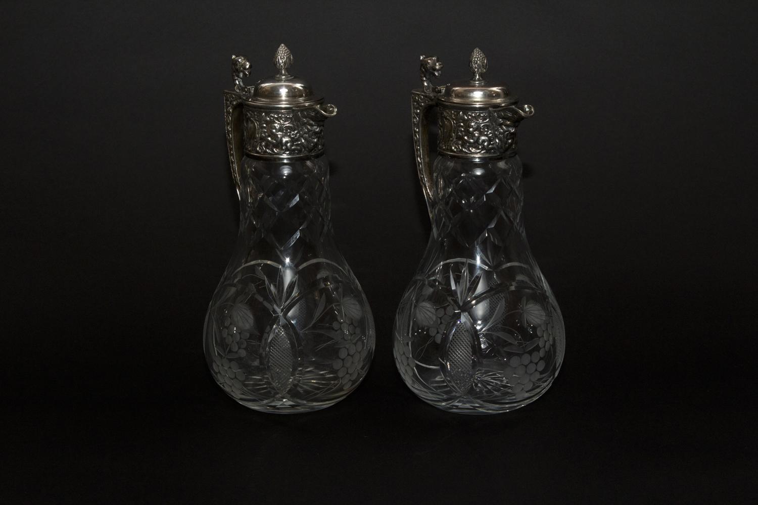 , ..A pair of glass jugs. Poland or Germany, end of the 20th centry.Glass, machine glass etching, copper top, nickel-plated.Height 32cm. No cracks glass, top metal framing with attritions, see photos.- , ,