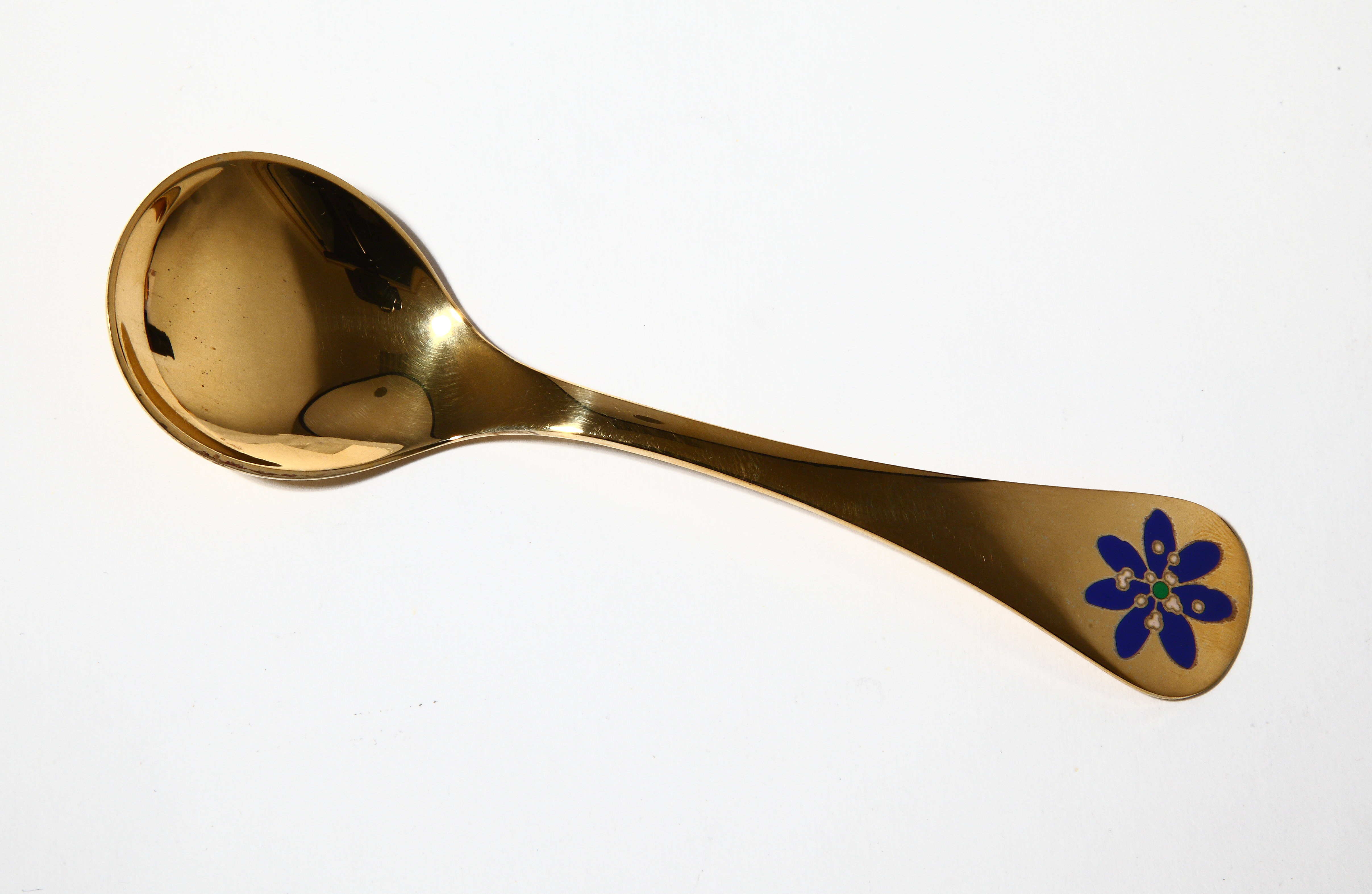 Десертная ложка 1986 года из годовой серии « астения сельской местности Дании»от всемирно известного дизайнерского дома «Georg Jensen».Будет великолепным подарком для тех, кто родился в 1986 году.Полностью позолоченная ложка имеет приятную обтекаемую форму.На верхней части ручки с внешней стороны изображено соцветие голубого анемона (эмаль),с обратной стороны ручки указан 1986 год.Изделия годовой серии выпускалось только в течение одного года, затем производственные формыуничтожались.Дания, Копенгаген, Georg Jensen, 1986 год.«Georg Jensen» - один из старейших дизайнерских домов Скандинавии, основанный в 1904 году выдающимсяювелиром Джорджем Енсеном (1866-1935). После смерти художника «New York Herald Tribune» чрезвычайноемко и выразительно определила его непревзойденное мастерство: «…The greatest silversmith of the last 300years…» ("величайший мастер серебряных дел за последние 300 лет").Сегодня дизайнерский дом «Georg Jensen» является частью ведущей европейской компании «Royal ScandinaviaGroup». Главные черты любого товара, носящего имя Georg Jensen - это функциональность, тщательный выборформы и материала, а также высокое качество исполнения.Чтобы всегда идти в ногу со временем, дизайнерский дом «Georg Jensen» привлекает к разработке новыхизделий только всемирно известных современных дизайнеров. Изделия, выпущенные в середине ХХ векадомом «Georg Jensen», уже сейчас ставят ценовые рекорды на аукционах серебряной посуды в США и Европе.С приходом в компанию талантливейшего дизайнера Annelise Bjørner была разработана годовая серия наборовдля десерта. Основным мотивом этой серии стала скромная, но трогательная своей изящной простотойсельская природа Дании. Каждое изделие из этой серии украшено одним из цветков, который имеет своеконкретное название. Например, ручка предлагаемой ложки 1986 года декорирована соцветием голубогоанемона.Изделия из серии « астения сельской местности Дании» выпускались с 1971 по 2003 год.Длина ложечки - 15см.Вес – 43 грамма серебра 925 пробы.Без гравировок.Смотрите фотографии.Если Вам что-то не видно на фотографиях, напишите, воспользовавшисьопцией "Обсудить лот", выложу более подробные фотографии.На ложке стоят следующие клейма:надпись «GEORG JENSEN» в овале, обрамленная точками – клеймо дизайнерского дома «Georg Jensen»;клеймо используется с 1945 года по настоящее время;«AB» - клеймо автора дизайна ложки Annelise Bjørner;надпись «Denmark Sterling 925S» - клеймо, удостоверяющее, что изделие выполнено в Дании из серебра925 пробы.