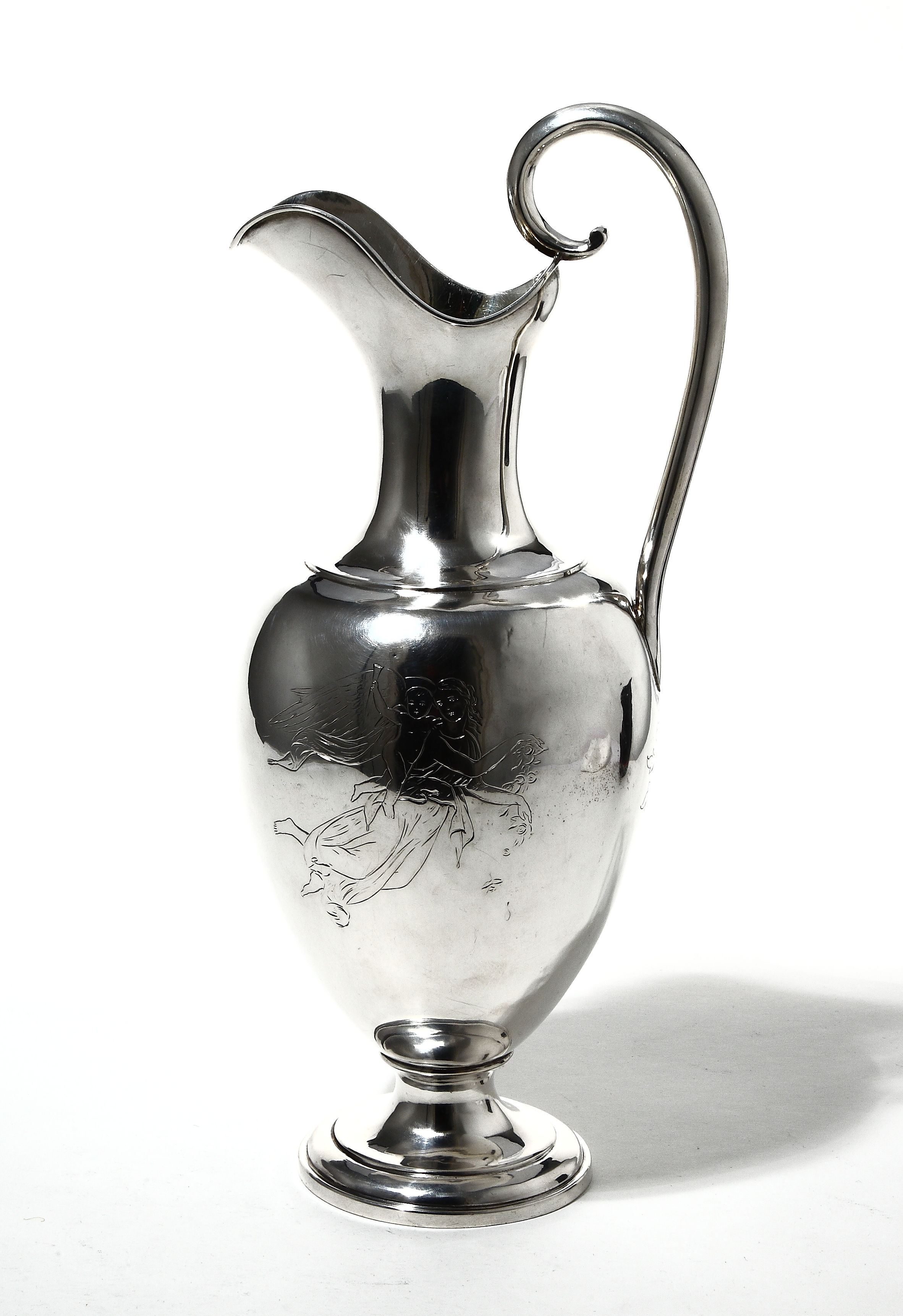 В данном лоте предлагается серебряный кувшин, декорированный образами из античной мифологии, выгравированными вручную.