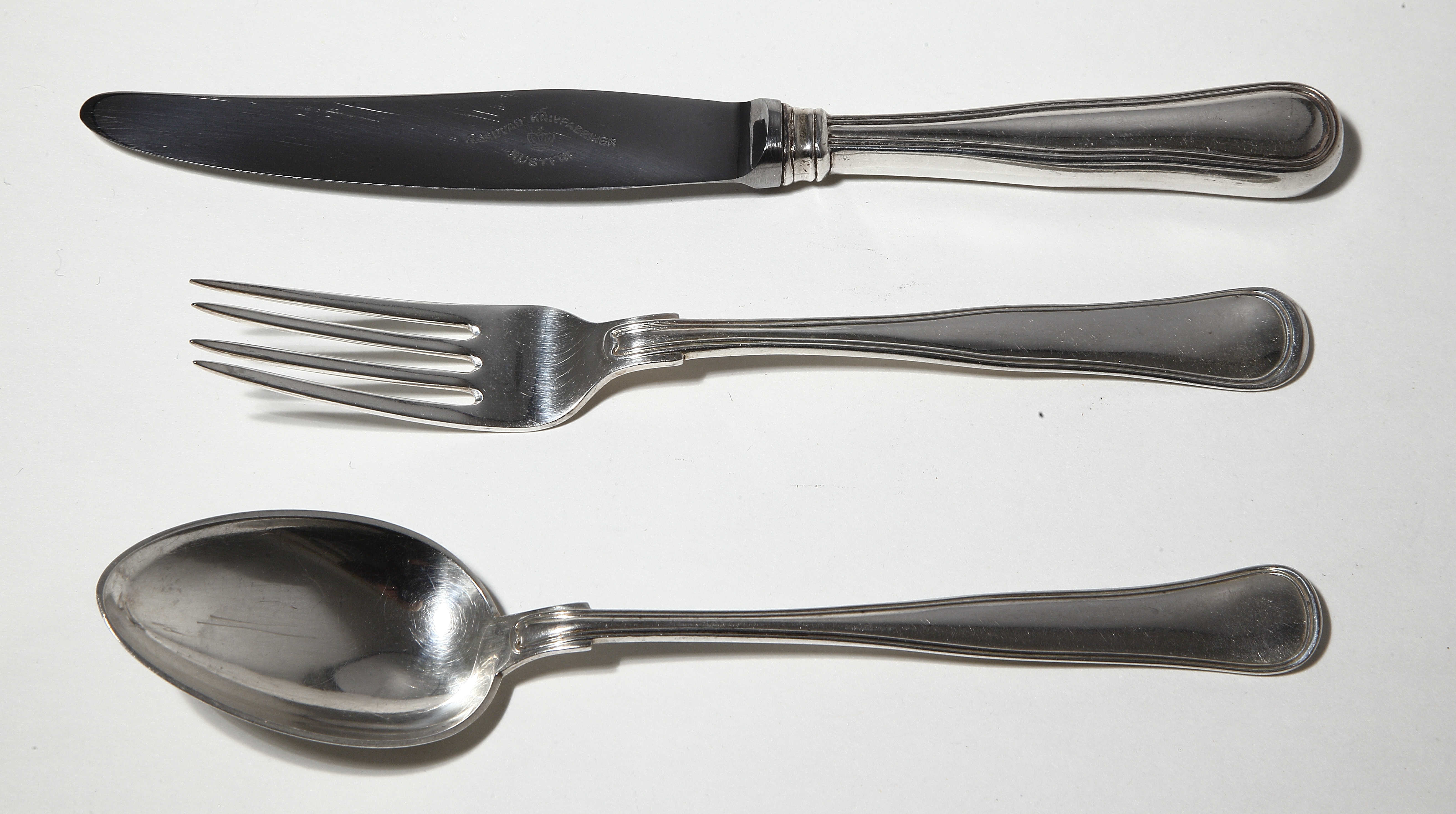 Дания, первая половина 20 века. Ложка: длина - 18,5см. Вилка: длина - 18см. Нож: длина - 21см. Вес полностью серебряных приборов - 80 граммов серебра не ниже 826 пробы. Общий вес набора - 128 граммов. Без гравировок. Без вмятин, крупных царапин и иных существенных повреждений. Состояние смотрите на фотографиях. Если Вам что-то не видно на фотографиях, напишите, воспользовавшись опцией "Обсудить лот", выложу более подробные фотографии. Датское пробирное клеймо для серебряных изделий с изображением трех башен, под которыми размещены две последние цифры года клеймения. С 1608 по 1893 год такое клеймо ставилось только на изделиях, произведенных в Копенгагене. С 1893 года это клеймо стало датским общенациональным клеймом, гарантирующим содержание серебра в клейменом изделии не ниже 826/1000 (826 пробы), и использовалось до 1977 года. ядом с «Тремя башнями» располагается клеймо в виде инициалов начальника пробирной палаты (Stadtsguardien) времени клеймения. На данном изделии это «JS» Jens Sigsgaard, руководитель пробирной палаты Дании с 1932 по 1960 год. В описании данного лота представлены лишь краткие сведения о нем. Если Вы действительно заинтересованы в покупке этого лота и не можете найти важной для Вас информации, дополнительных фотографий, размеров, описания клейм, Вы всегда можете запросить эту информацию через форму обсуждения лота - "задать вопрос продавцу".   Кликнув по ниже указанным картинкам, Вы сможете рассмотреть лот на более качественных фотографиях, чем это позволяет сделать "Молоток":