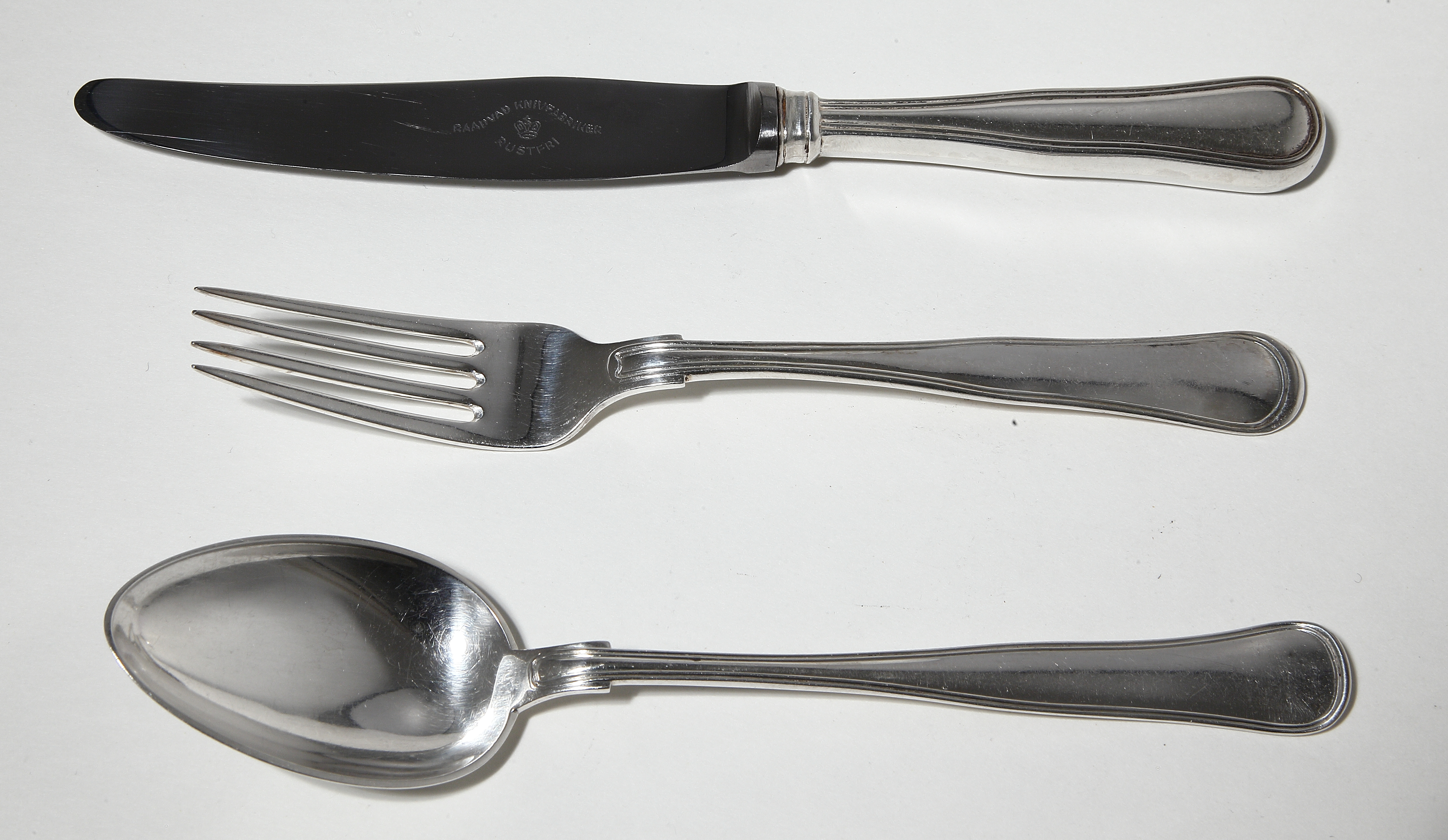 Дания, первая половина 20 века.Ложка: длина - 18,5смВилка: длина - 17,9см.Нож с серебряной ручкой и стальным лезвием: длина - 21см.Вес полностью серебряных приборов - 80 граммов серебра не ниже 826 пробы.Общий вес набора - 129 граммов.