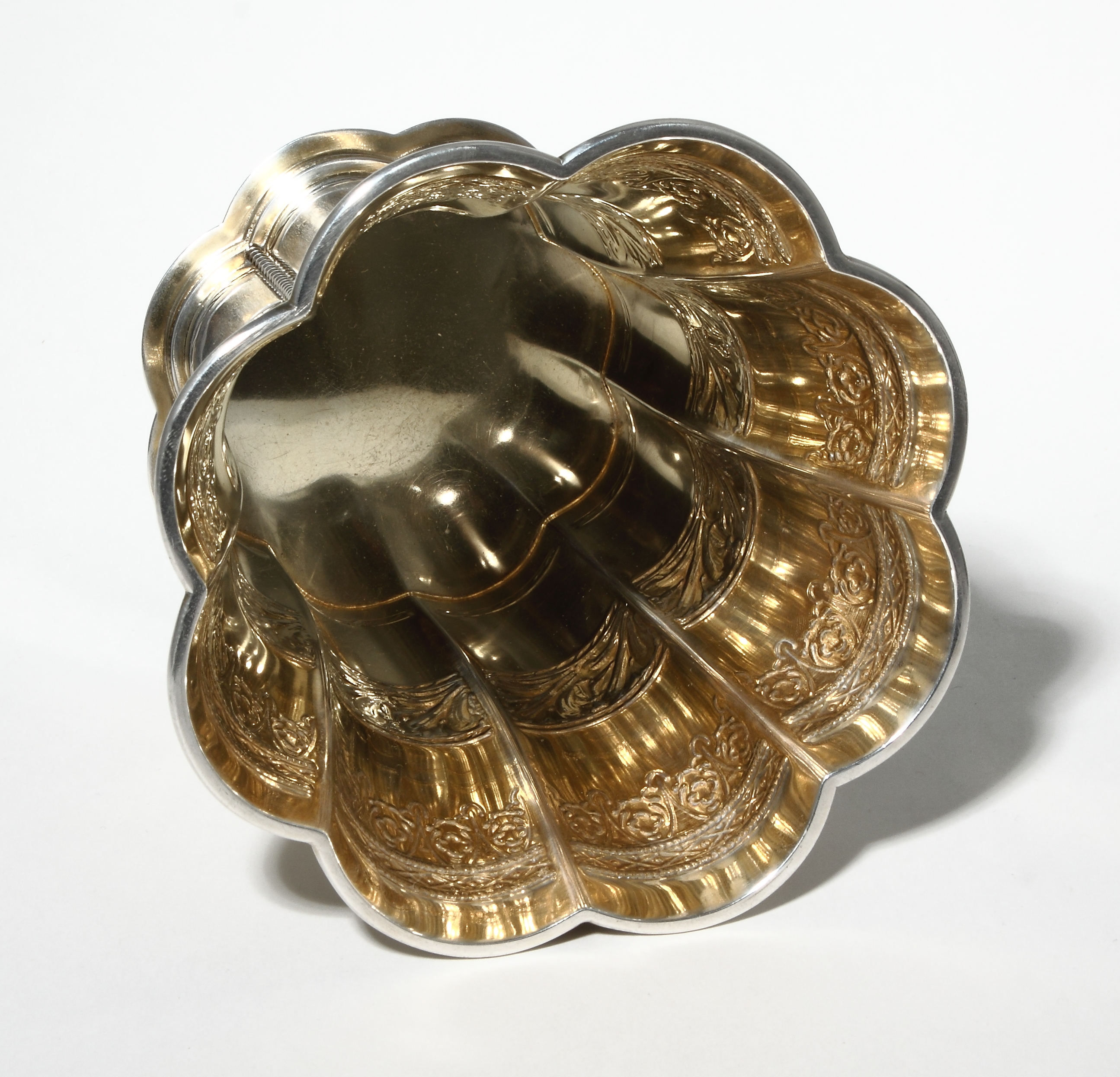 |  |  |  | Согласно преданию, королева Маргрет I (1353-1412гг.) очень боялась быть отравленной, поэтому у нее было 7 специальных слуг, которые пробовали напитки перед королевской трапезой. Так как королевская особа не могла прикоснуться устами к бокалу, из которого уже пили слуги, придворным ювелиром был разработан бокал особого дизайна, состоящего из 8 лепестков. Практически в каждом доме настоящего датчанина есть аналогичный "Margrethe cup", поскольку это своего рода символ здоровья и благополучия, аналог нашей подковы, висящей над дверью. Используют их не только для употребления вина, но и как вазочки для салфеток или небольших цветов. Дания, середина ХХ века. Высота - 12,3см, диаметр верха - 15см. Вес - 622 грамма серебра 925 пробы. Без гравировок. Без вмятин, крупных царапин и иных существенных повреждений. Состояние смотрите на фотографиях. Если Вам что-то не видно на фотографиях, напишите, воспользовавшись опцией "Обсудить лот", выложу более подробные фотографии. Клеймо мастерской. Клейма "Denmark", "Sterling" и "925S" удостоверяют, сто изделие произведено в Дании из серебра 925 пробы.  Кликнув по ниже указанным картинкам, Вы сможете рассмотреть лот на более качественных фотографиях, чем это позволяет сделать "Молоток":