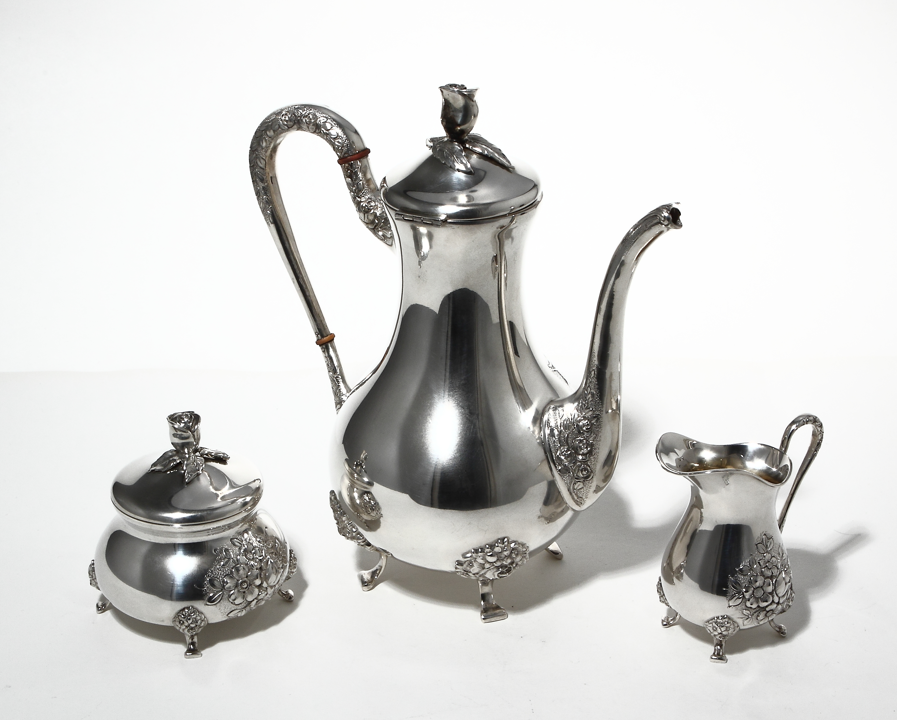 Высота кофейника - 25,5см.Общий вес изделий - 1305 граммов серебра 830 пробы.