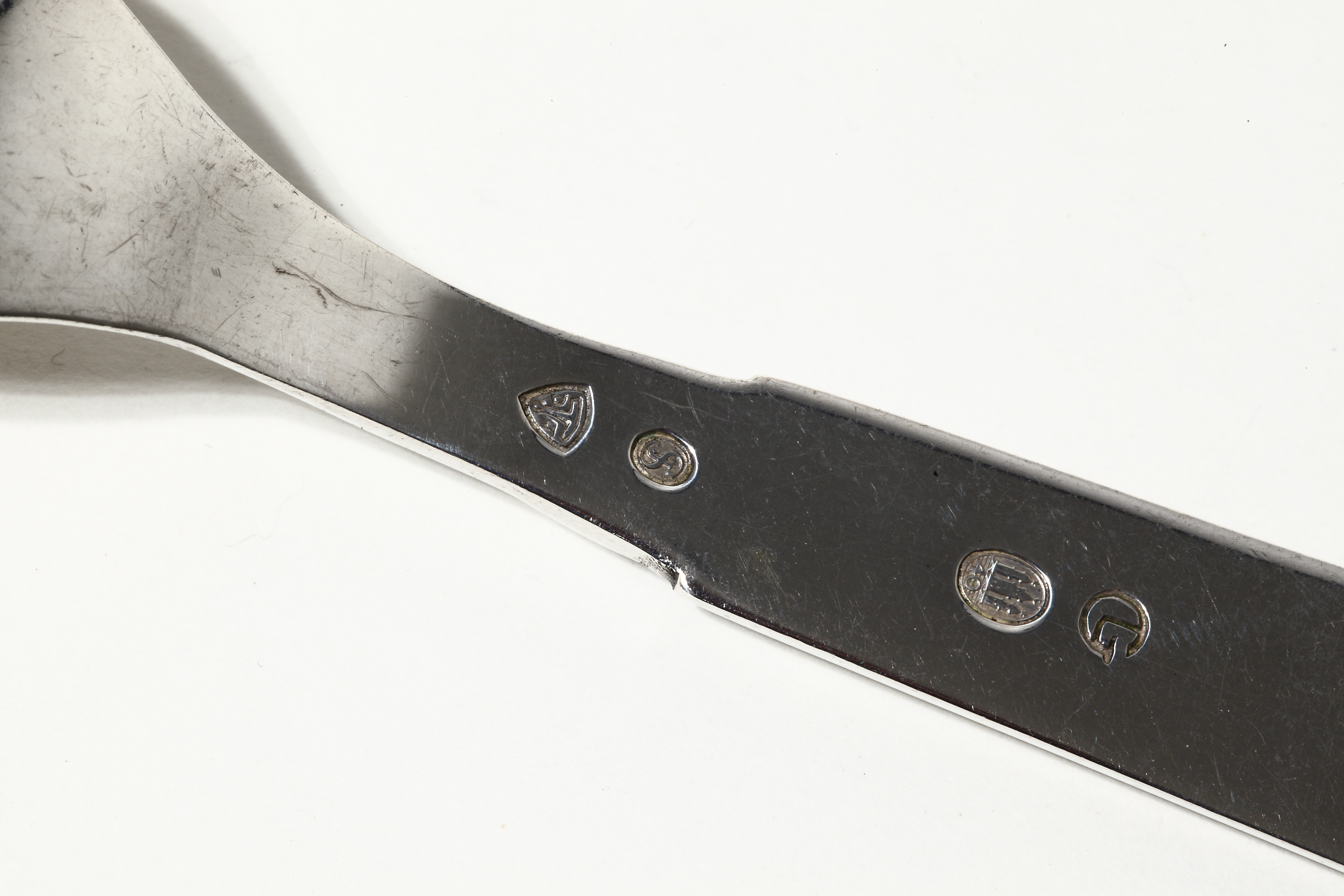только на изделиях, произведенных в Копенгагене. С 1893 года это клеймо стало датскимобщенациональным клеймом, гарантирующим содержание серебра в клейменом изделии не ниже826/1000 (826 пробы), и использовалось до 1977 года.ядом с «Тремя башнями» располагается клеймо в виде инициалов начальника пробирной палаты(Stadtsguardien) времени клеймения. На данном изделии это «JS» Jens Sigsgaard, руководительпробирной палаты Дании с 1932 по 1960 год.