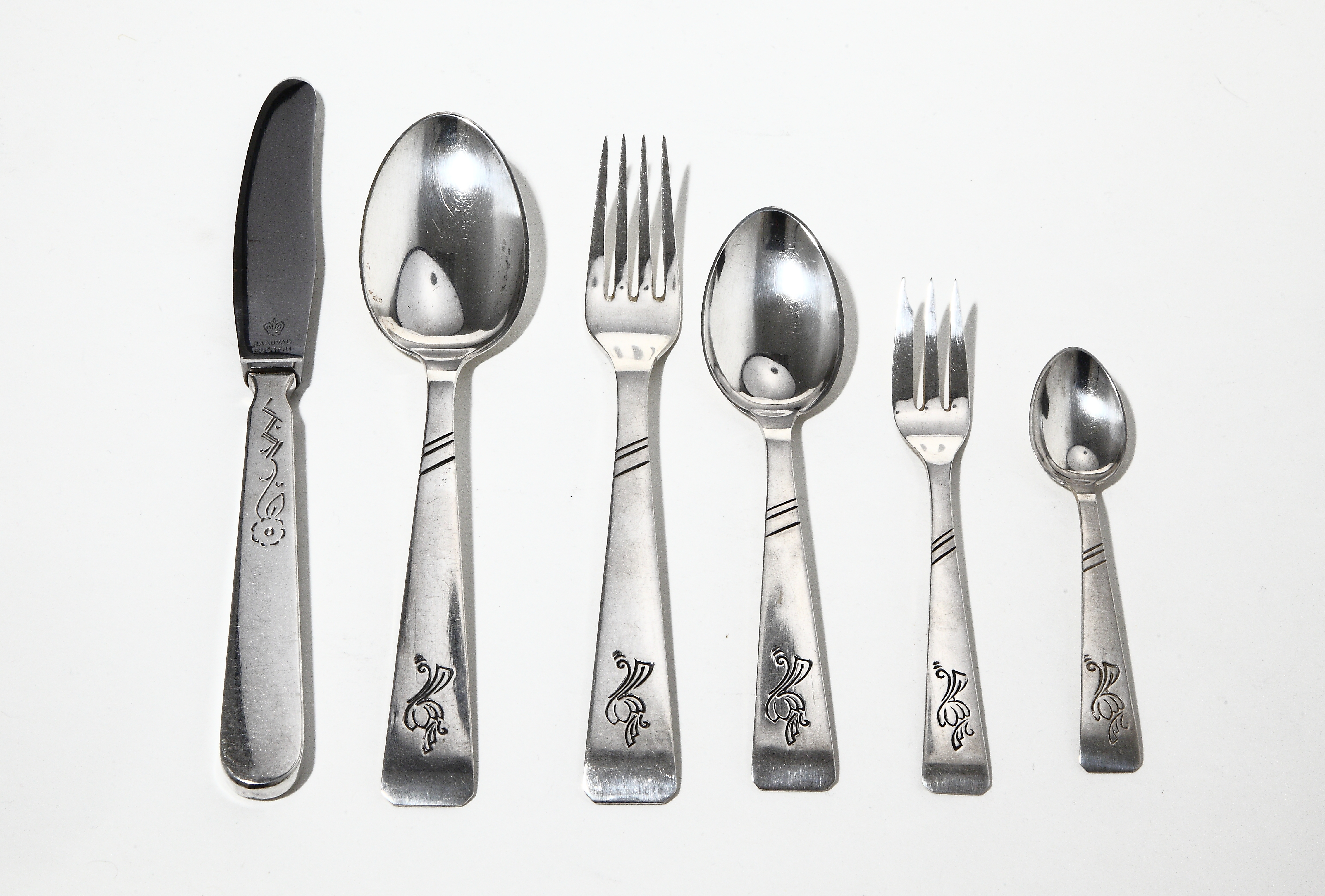 На всех приборах, кроме ножа, стоит датское пробирное клеймо для серебряных изделий с изображением трех башен, под которыми размещены две последние цифры года клеймения. С 1608 по 1893 год такое клеймо ставилось только на изделиях, произведенных в Копенгагене. С 1893 года это клеймо стало датским общенациональным клеймом, гарантирующим содержание серебра в клейменом изделии не ниже 826/1000 (826 пробы), и использовалось до 1977 года. ядом с «Тремя башнями» располагается клеймо в виде инициалов начальника пробирной палаты (Stadtsguardien) времени клеймения. На данном изделии это «JS» Jens Sigsgaard, руководитель пробирной палаты Дании с 1932 по 1960 год. На ручке ножа стоит цифровое клеймо "925S", которое удостоверяет 925 пробу серебра.  Кликнув по ниже указанным картинкам, Вы сможете рассмотреть лот на более качественных фотографиях, чем это позволяет сделать "Молоток":
