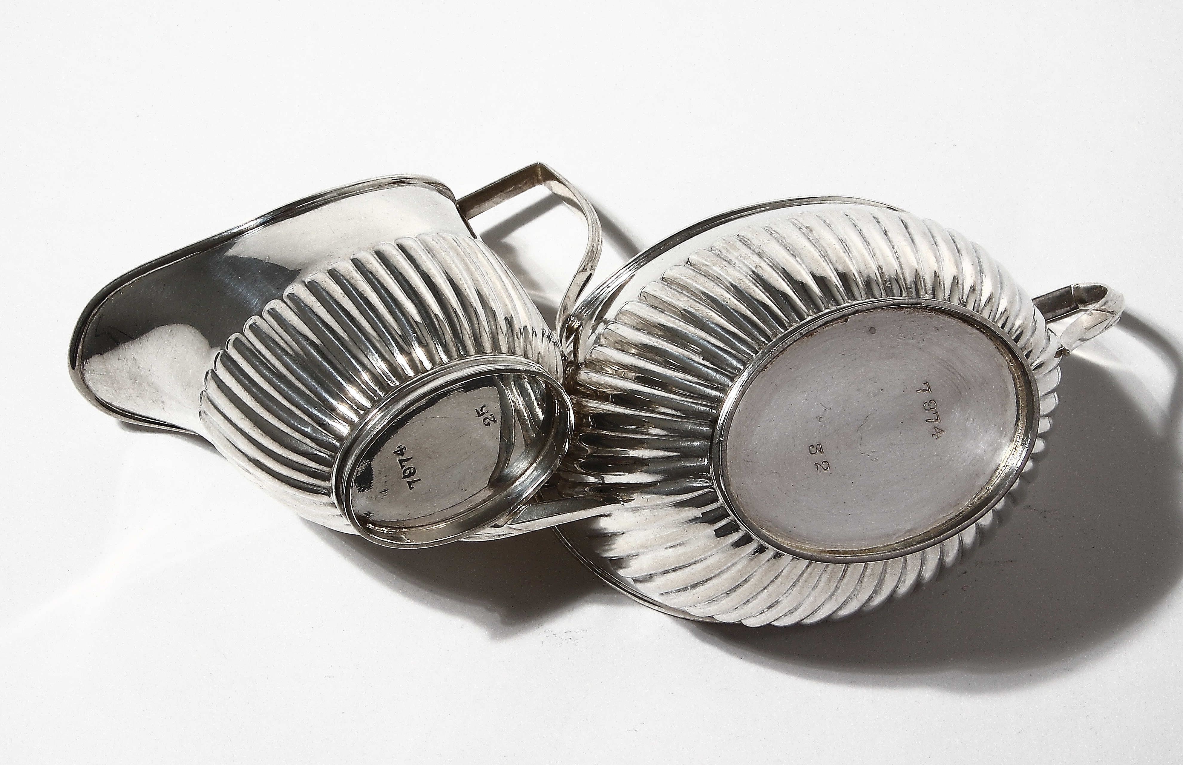 Чайник: высота по ручку крышки - 12,3см.Сахарница: высота по ручку - 7см.Молочник: высота по ручку - 7см.Общий вес - 413 граммов серебра 925 пробы.