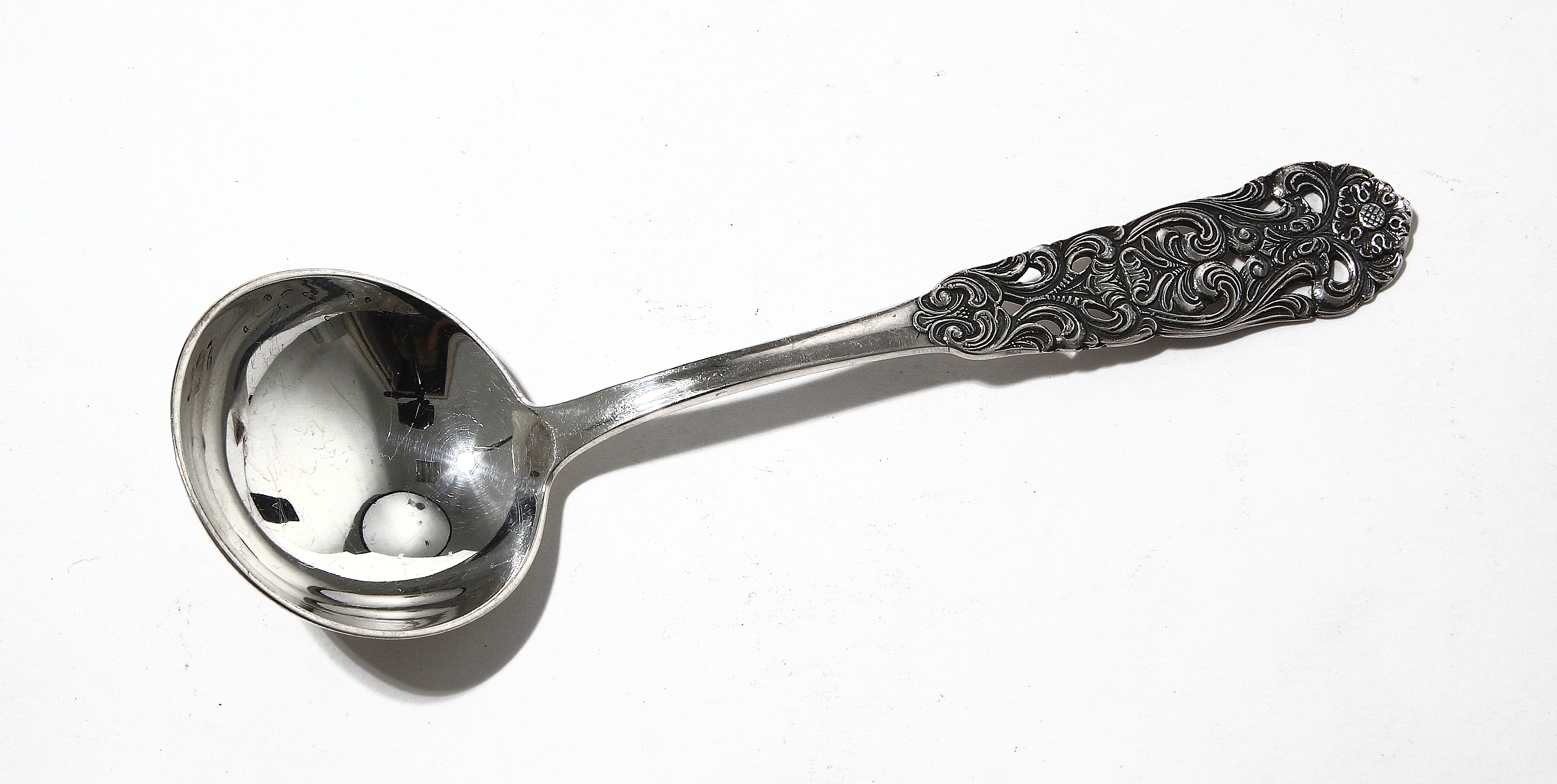 В данном лоте предлагается серебряная ложка с глубоким круглым черпаком, которая