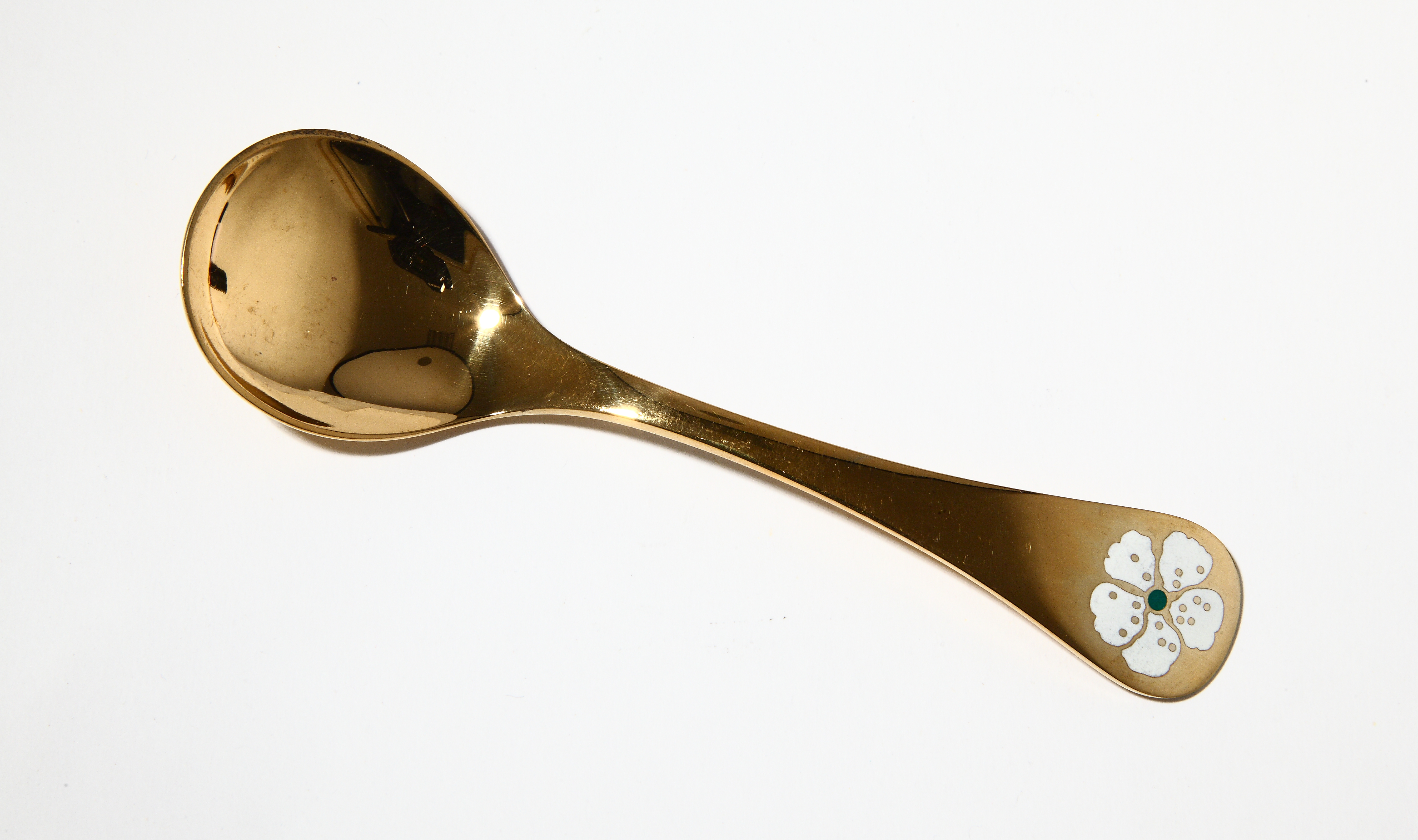 Десертная ложечка 1971 года из годовой серии « астения сельской местности Дании»от всемирно известного дизайнерского дома «Georg Jensen».Будет великолепным подарком для тех, кто родился в 1971 году.Полностью позолоченная ложка имеет приятную обтекаемую форму.На верхней части ручки с внешней стороны изображен белый цветок (эмаль),с обратной стороны ручки указан 1971 год.Изделия годовой серии выпускалось только в течение одного года, затем производственные формы уничтожались.Дания, Копенгаген, Georg Jensen, 1971 год.«Georg Jensen» - один из старейших дизайнерских домов Скандинавии, основанный в 1904 году выдающимсяювелиром Джорджем Енсеном (1866-1935). После смерти художника «New York Herald Tribune» чрезвычайноемко и выразительно определила его непревзойденное мастерство: «…The greatest silversmith of the last 300years…» ("величайший мастер серебряных дел за последние 300 лет").Сегодня дизайнерский дом «Georg Jensen» является частью ведущей европейской компании «Royal ScandinaviaGroup». Главные черты любого товара, носящего имя Georg Jensen - это функциональность, тщательный выборформы и материала, а также высокое качество исполнения.Чтобы всегда идти в ногу со временем, дизайнерский дом «Georg Jensen» привлекает к разработке новыхизделий только всемирно известных современных дизайнеров. Изделия, выпущенные в середине ХХ векадомом «Georg Jensen», уже сейчас ставят ценовые рекорды на аукционах серебряной посуды в США и Европе.С приходом в компанию талантливейшего дизайнера Annelise Bjørner была разработана годовая серия наборовдля десерта. Основным мотивом этой серии стала скромная, но трогательная своей изящной простотойсельская природа Дании. Каждое изделие из этой серии украшено одним из цветков, который имеет своеконкретное название. Например, ручка предлагаемой ложечки 1971 года декорирована белым цветком.Ложки из серии « астения сельской местности Дании» выпускались с 1971 по 2003 год.Длина ложечки - 15см.Вес – 46 граммов серебра 925 пробы.Без гравировок.Смотрите фотографии. Если Вам что-то не видно на фотографиях, напишите, воспользовавшись опцией"Обсудить лот", выложу более подробные фотографии.На ложечке стоят следующие клейма:надпись "GEORG JENSEN" в овале, обрамленная точками – клеймо дизайнерского дома «Georg Jensen»; клеймоиспользуется с 1945 года по настоящее время;буквы «RA AB» - клеймо автора дизайна Annelise Bjørner;надпись «Denmark Sterling» - клеймо, удостоверяющее, что изделие выполнено в Дании из серебра 925 пробы.