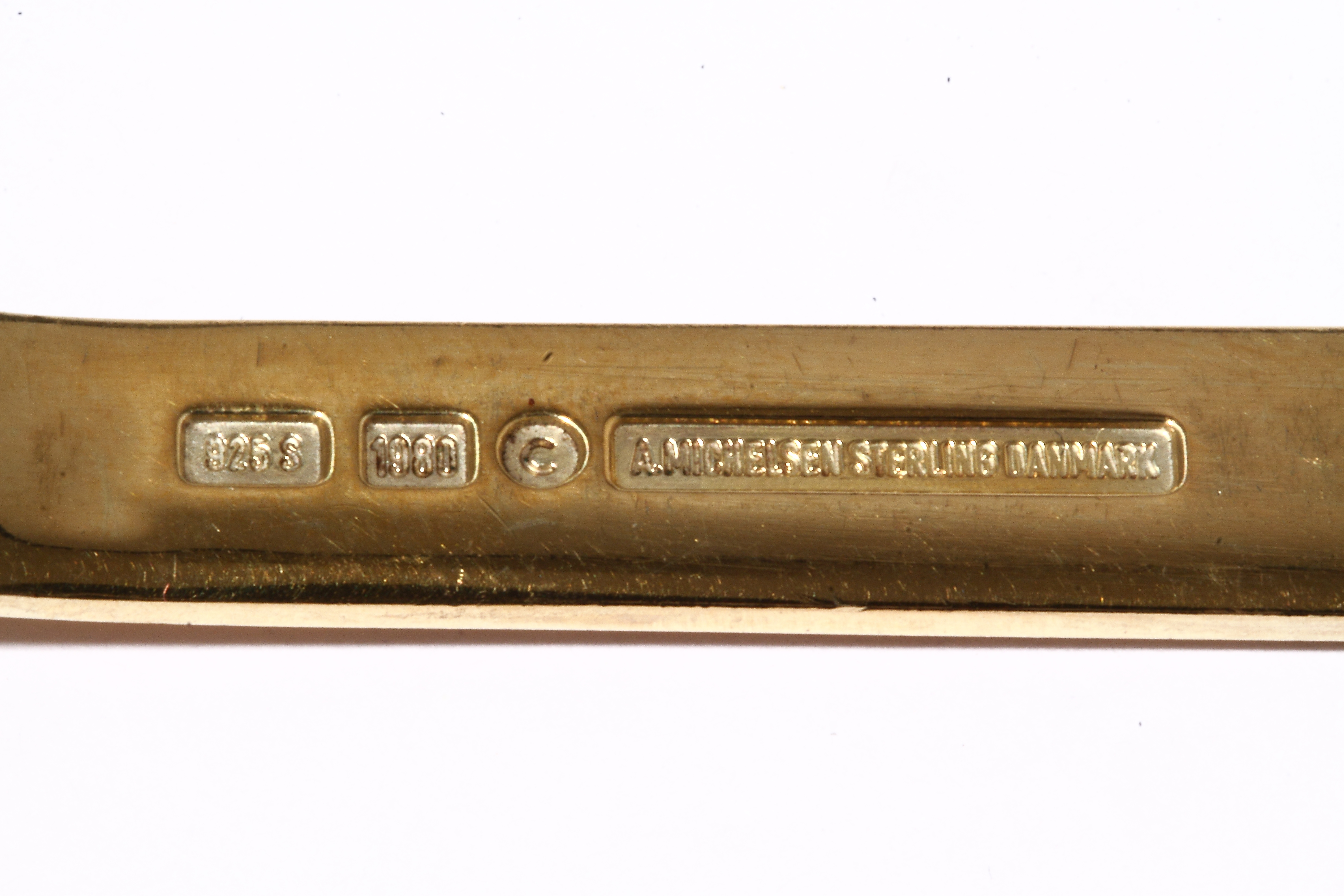 The Mask»), из годовой серии от Anton Michelsen. учки приборов декорированы эмалевым изображением маски, выполненной в технике гильоширования в сочетании с перегородчатой эмалью. Дания, г.Копенгаген, A.MICHELSEN, 1980 год. Ложка: длина - 16.5см. Вилка: длина – 16,2см. Общий вес - 92 грамма серебра 925 пробы. Без гравировок. Без вмятин, крупных царапин и иных существенных повреждений. Состояние смотрите на фотографиях. Если Вам что-то не видно на фотографиях, напишите, воспользовавшись опцией "Обсудить лот", выложу более подробные фотографии. С 1910 года именитый датский производитель столового серебра A.Michelsen выпускает каждый год так называемую Christmas Spoon, которую традиционно датчане, да и не только, включают в рождественские подарки близким. Авторами дизайна становятся наиболее интересные датские дизайнеры, художники, скульпторы. В данном случае дизайн изделий был разработан Egill Jacobsen. На обратной стороне ручек стоит клеймо автора дизайна. На изделиях имеется клеймо «A.MICHELSEN STERLING DANMARK» - клеймо известного датского производителя серебряных изделий, поставщика королевского двора. Помимо авторства, данное клеймо удостоверяет, что изделия произведены в Дании из стерлингового серебра (925 проба). Цифровое клеймо "925S" дополнительно удостоверяет, что изделия выполнены из серебра 925 пробы.  Кликнув по ниже указанным картинкам, Вы сможете рассмотреть лот на более качественных фотографиях, чем это позволяет сделать "Молоток":