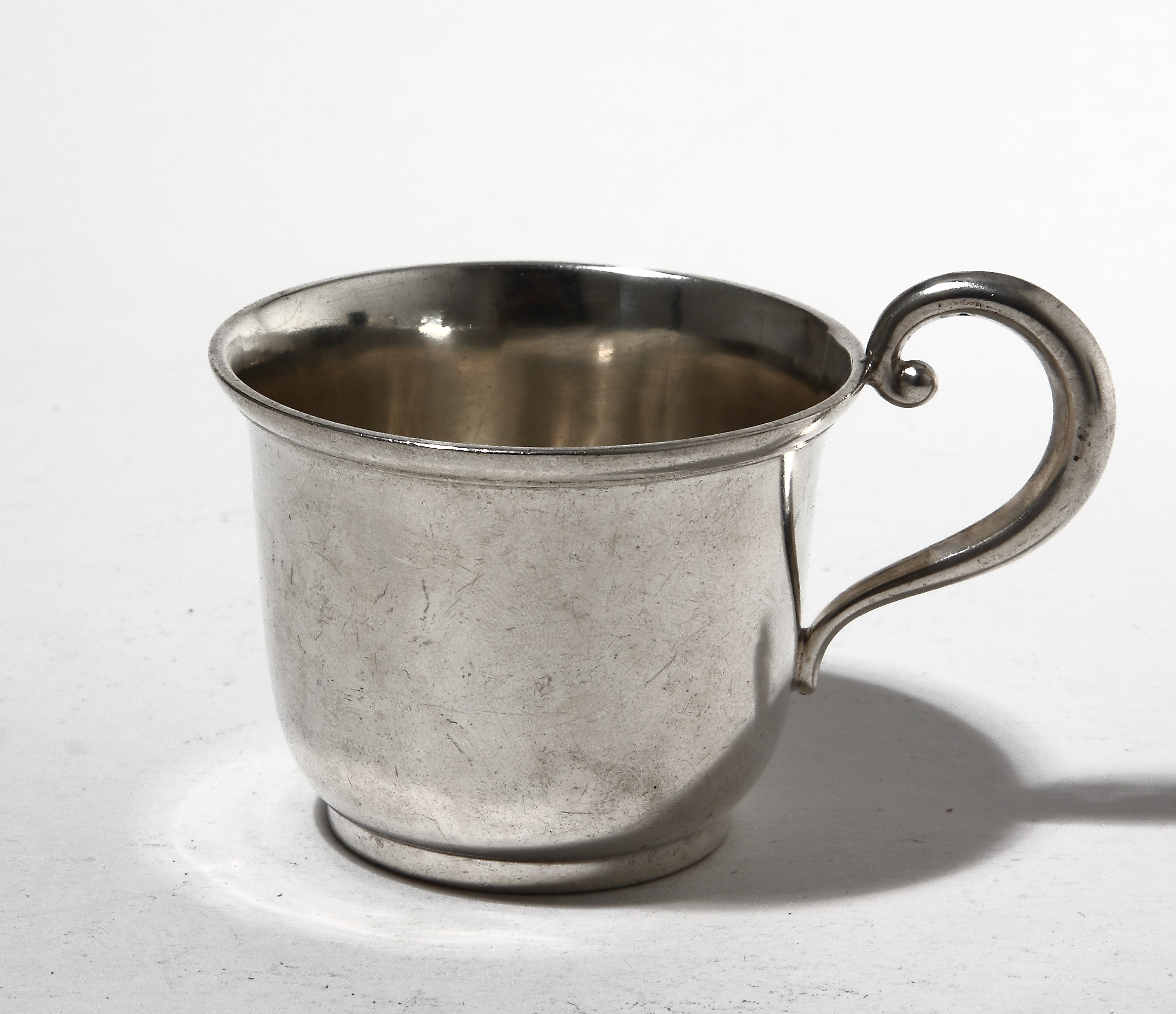 Детская серебряная кружечка.Дания, 1947 год.Высота - 4,9см, диаметр верха - 6,3см.Вес - 47 граммов серебра не ниже 826 пробы.