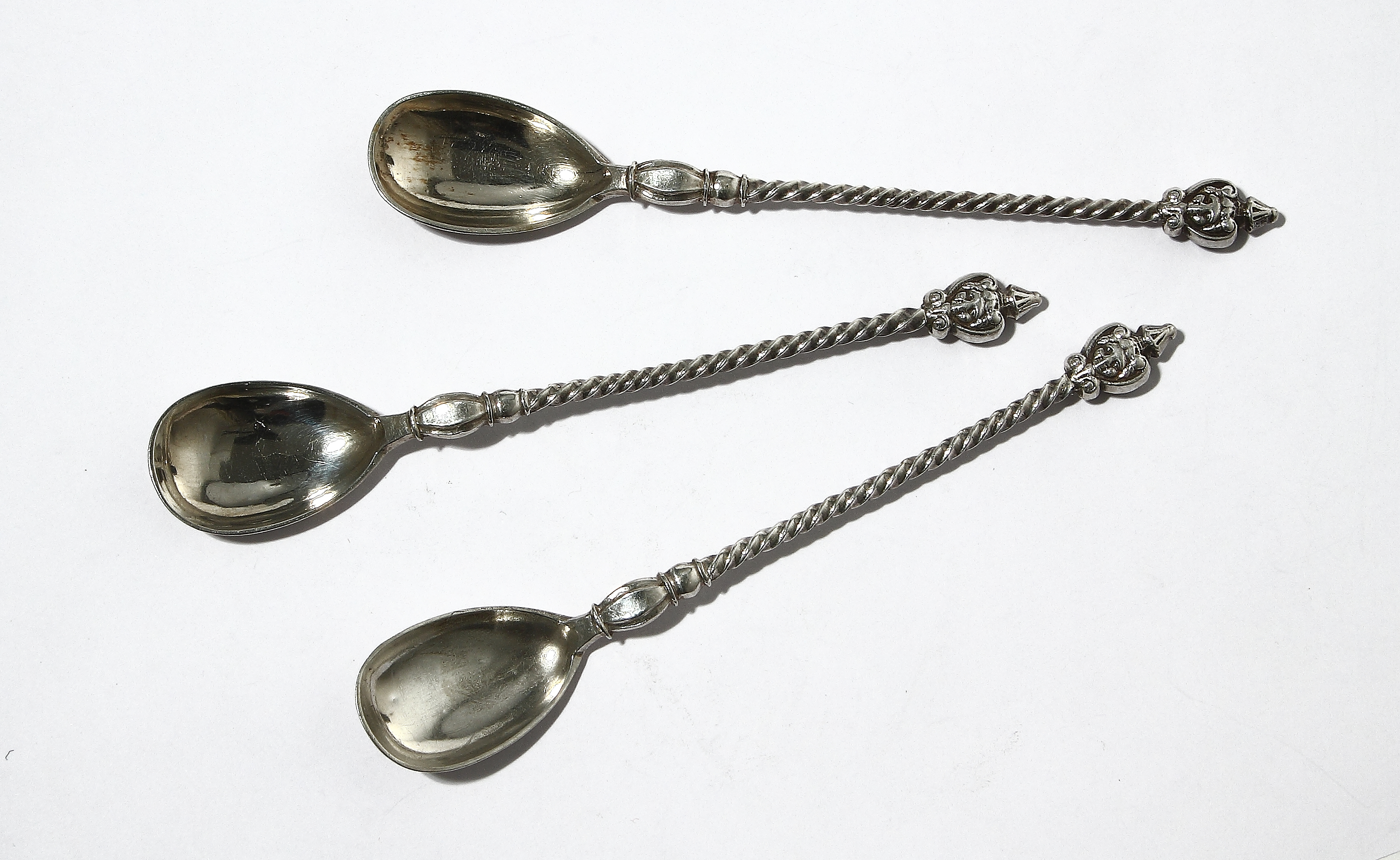 Три старинные кофейные ложечки с винтовыми ручками, декорированными маскаронами.