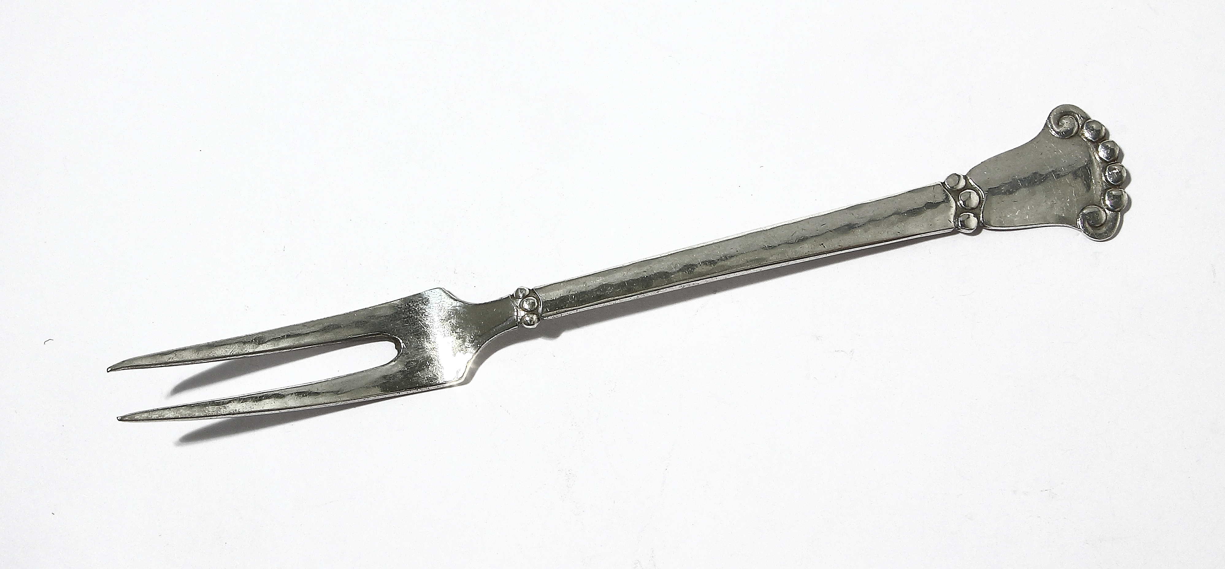 Серебряная сервировочная вилка, выполненная в стиле арт нуво.