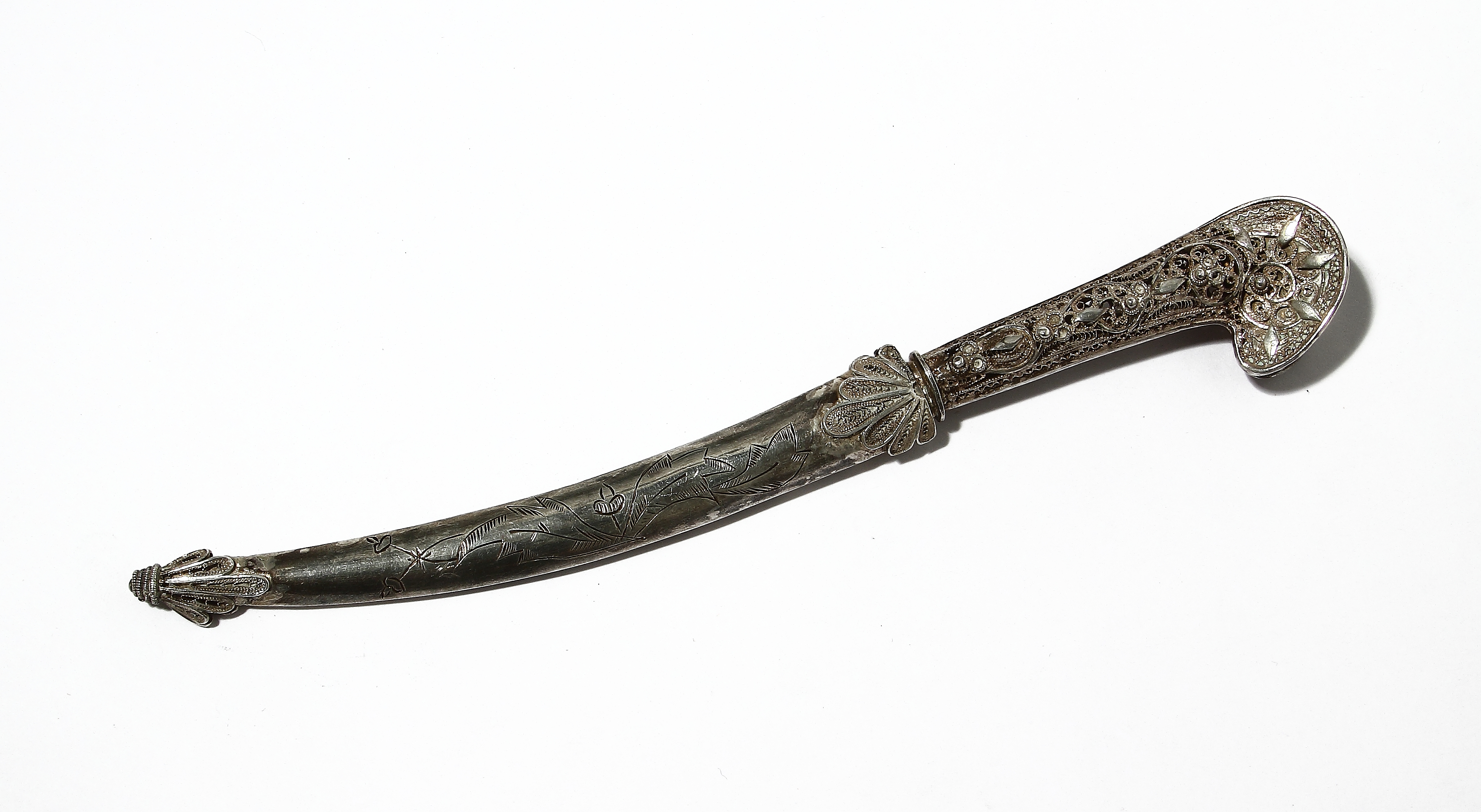 Длина изделия в ножнах - 27см.Вес - 61 грамм серебра 925 пробы.