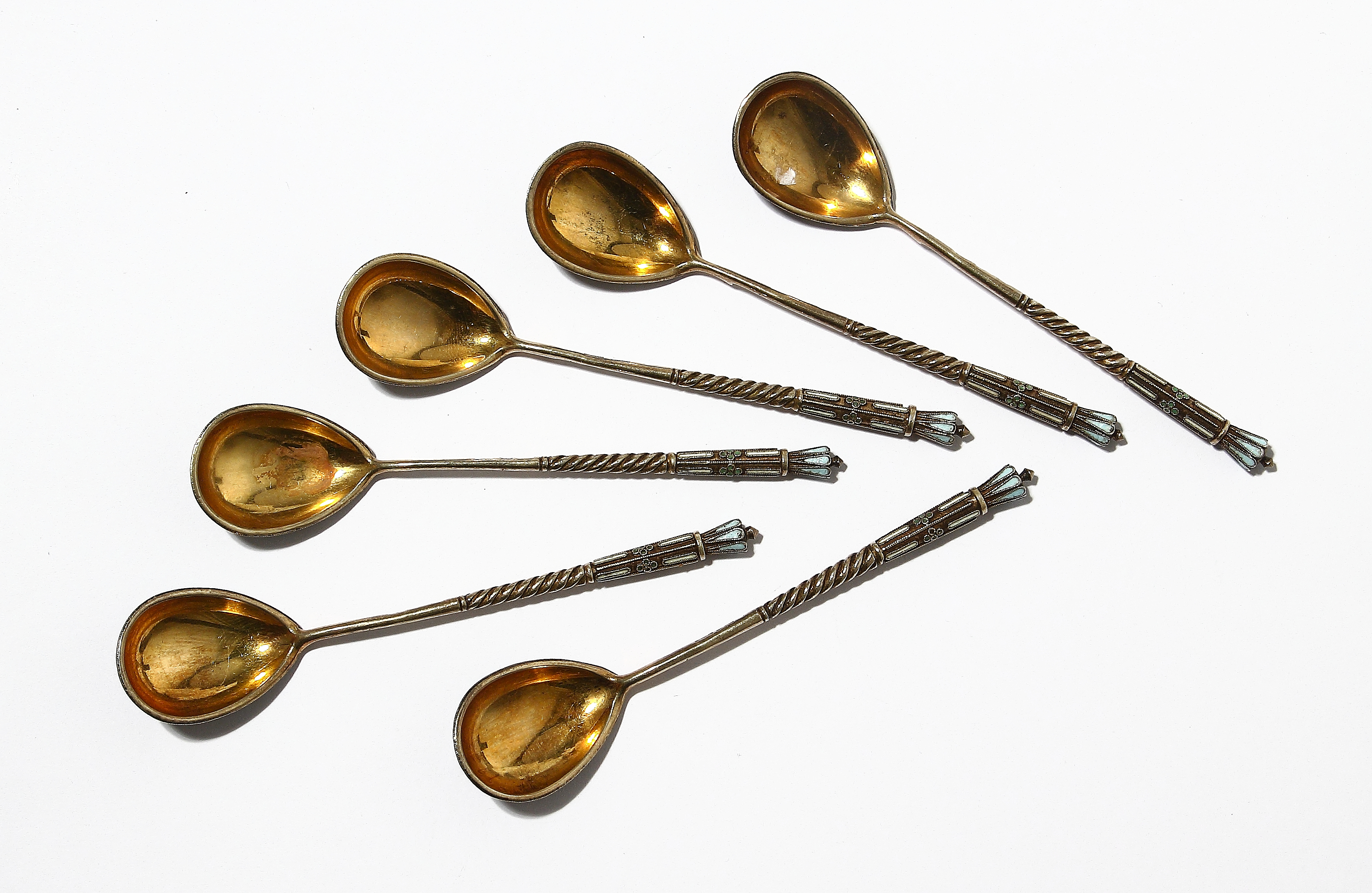 6 чайных ложек, 84 проба. Эмаль, русский модерн.