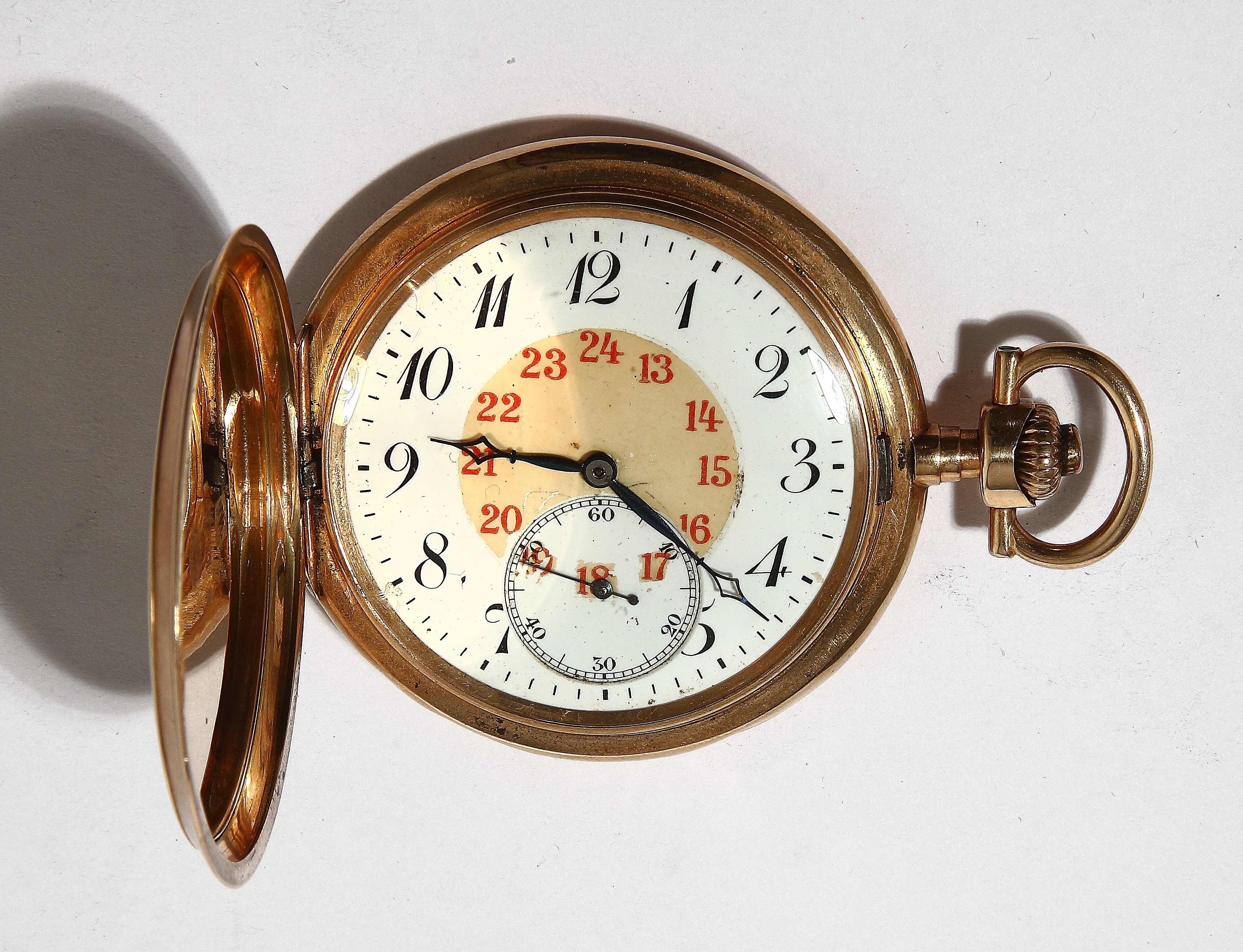 Малый циферблат песочного цвета с красными арабскими цифрами в формате от 13 до 24.