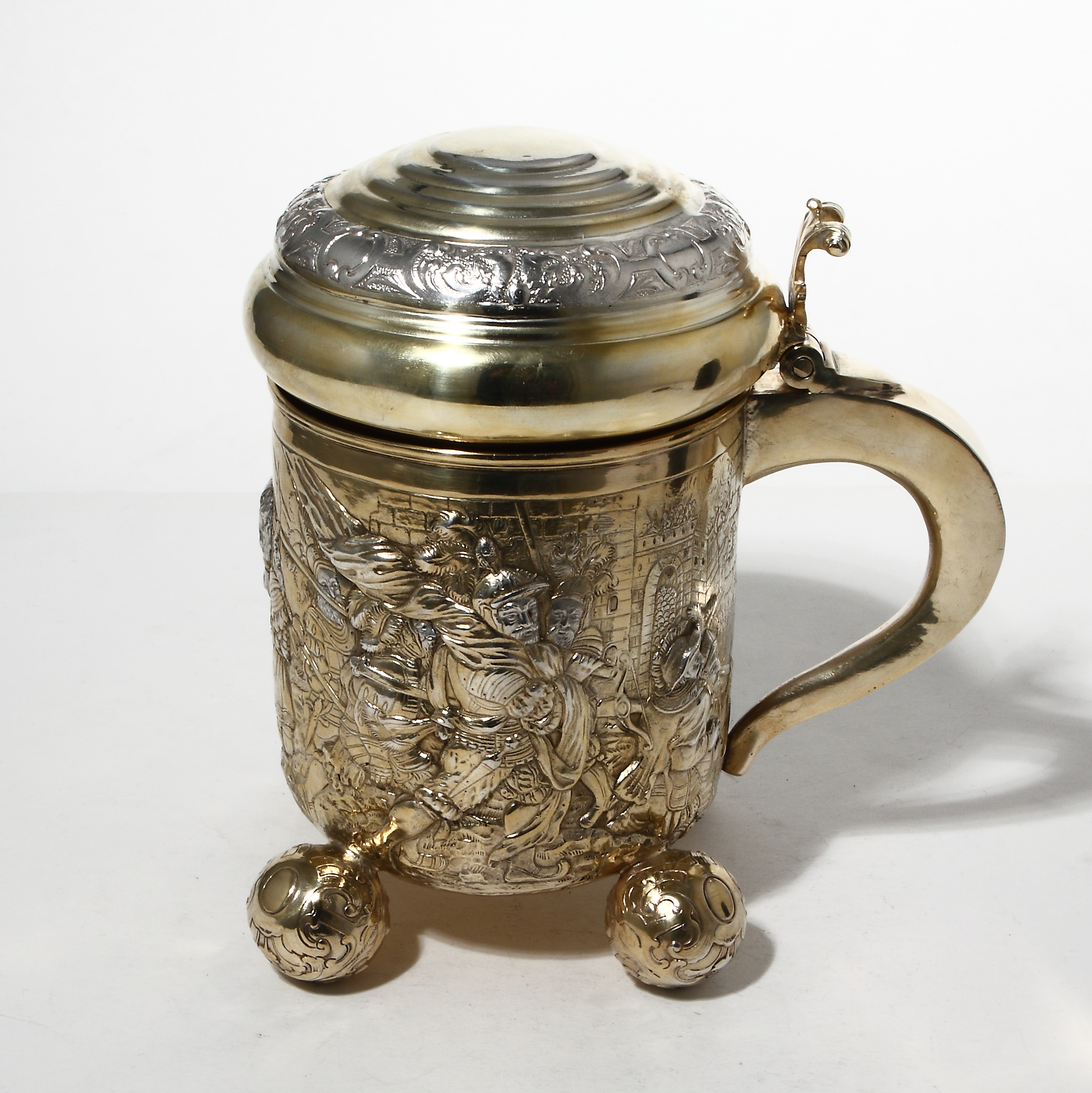 Богато декорированная позолоченная пивная кружка.Германия, после 1886 года.Высота - 21см, диаметр верха - 12,5см.Вес - 1130 граммов серебра 835 пробы.
