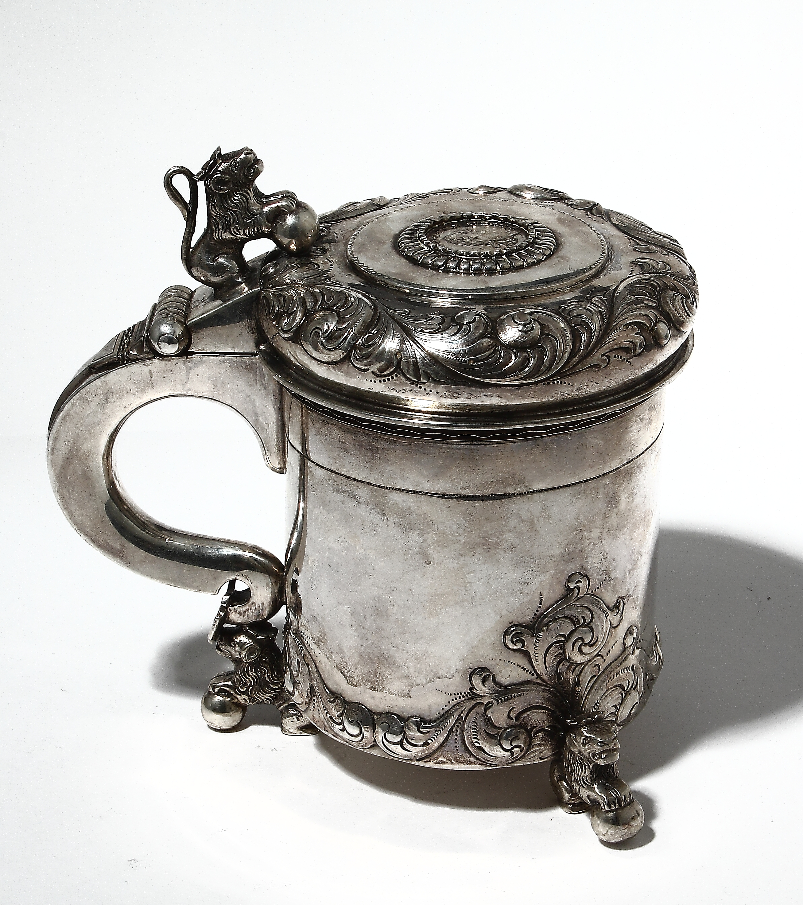 Массивная серебряная пивная кружка со львами, выполненная в стиле барокко.