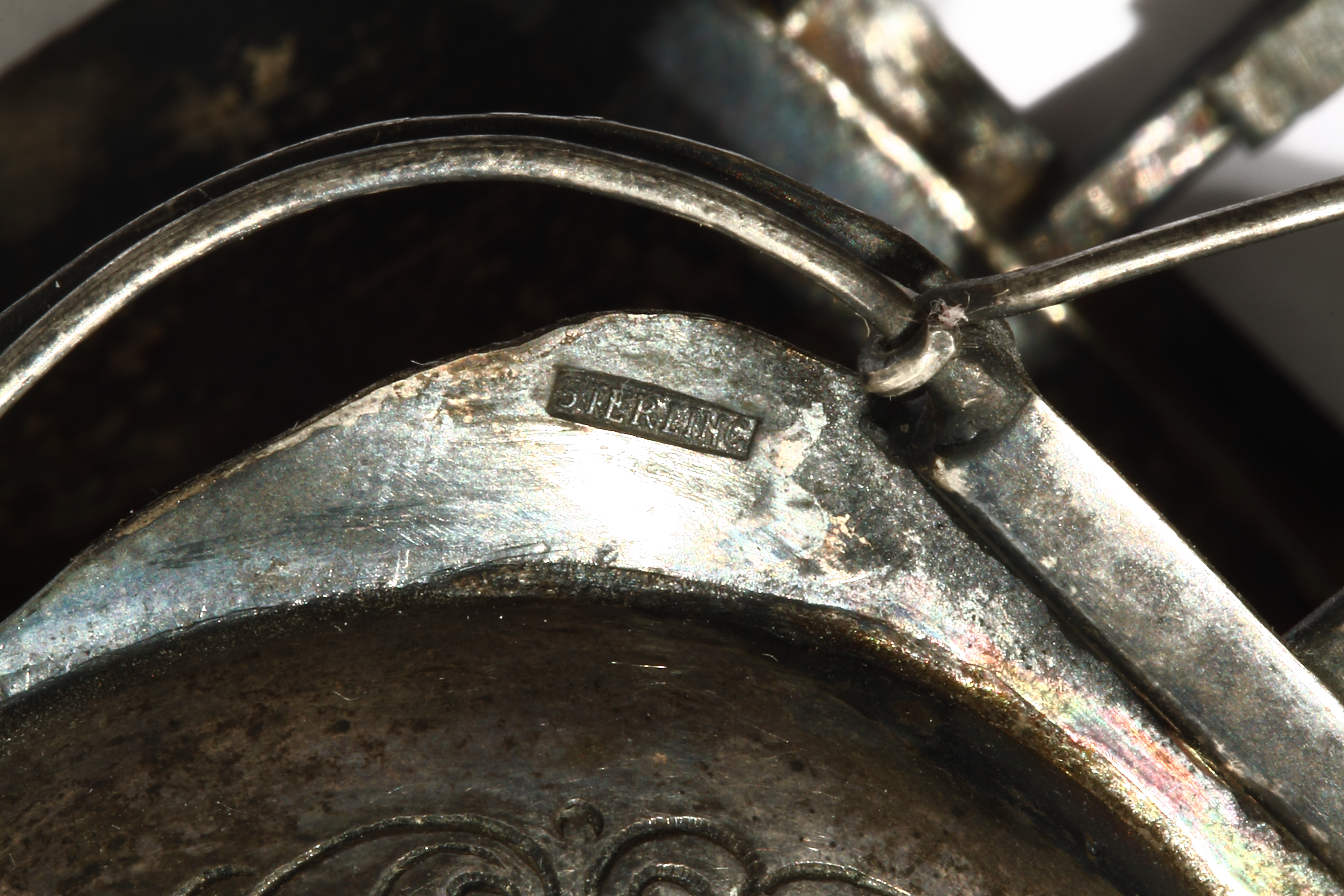 Максимальная высота - 8см, длина - 10,5см, ширина - 4,5см. Вес - 72 грамма серебра 925 пробы. Без гравировок. Без вмятин, крупных царапин и иных существенных повреждений. Изделие покрыто темной патиной. Состояние смотрите на фотографиях. Если Вам что-то не видно на фотографиях, напишите, воспользовавшись опцией "Обсудить лот", выложу более подробные фотографии. Клейм "Sterling" удостоверяет, что изделие выполнено из серебра 925 пробы. В описании данного лота представлены лишь краткие сведения о нем. Если Вы действительно заинтересованы в покупке этого лота и не можете найти важной для Вас информации, дополнительных фотографий, размеров, описания клейм, Вы всегда можете запросить эту информацию через форму обсуждения лота - "задать вопрос продавцу".   Кликнув по ниже указанным картинкам, Вы сможете рассмотреть лот на более качественных фотографиях, чем это позволяет сделать "Молоток":