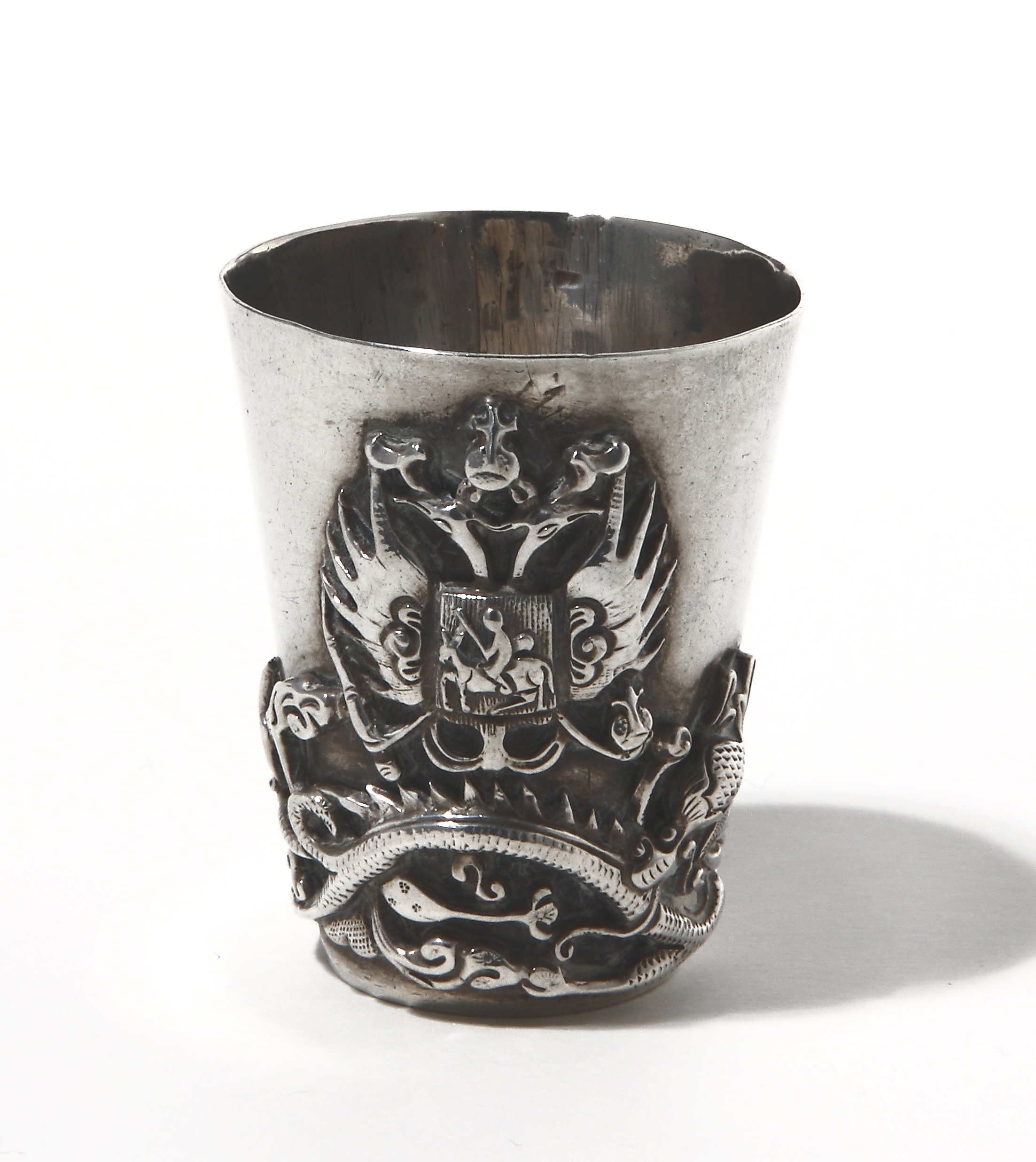 Изделие декорировано рельефным гербом с изображением всадника, поражающего мечом дракона. По сути, это российский герб в интерпретации китайского художника.