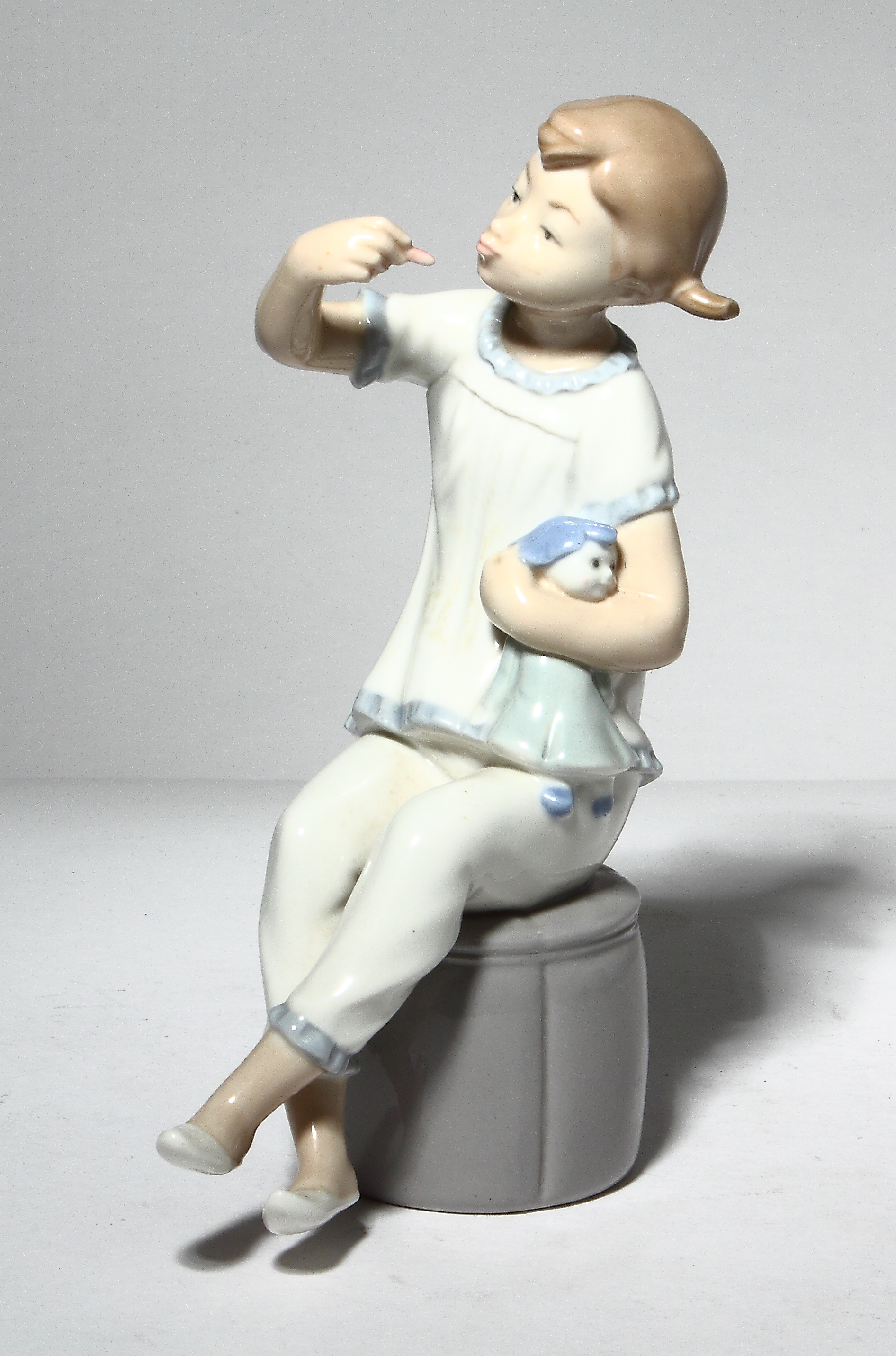 Фарфоровая статуэтка "Девочка с куклой, сидящая на пуфике". учная полихромная роспись.Испания, Валенсия, Тавернес Бланкес, Lladro, скульптор Vicente Martinez.Год создания: 1970.Год окончания: 1985.Высота - 17,5 см.Сохранность коллекционная. Без сколов, повреждений и утрат.