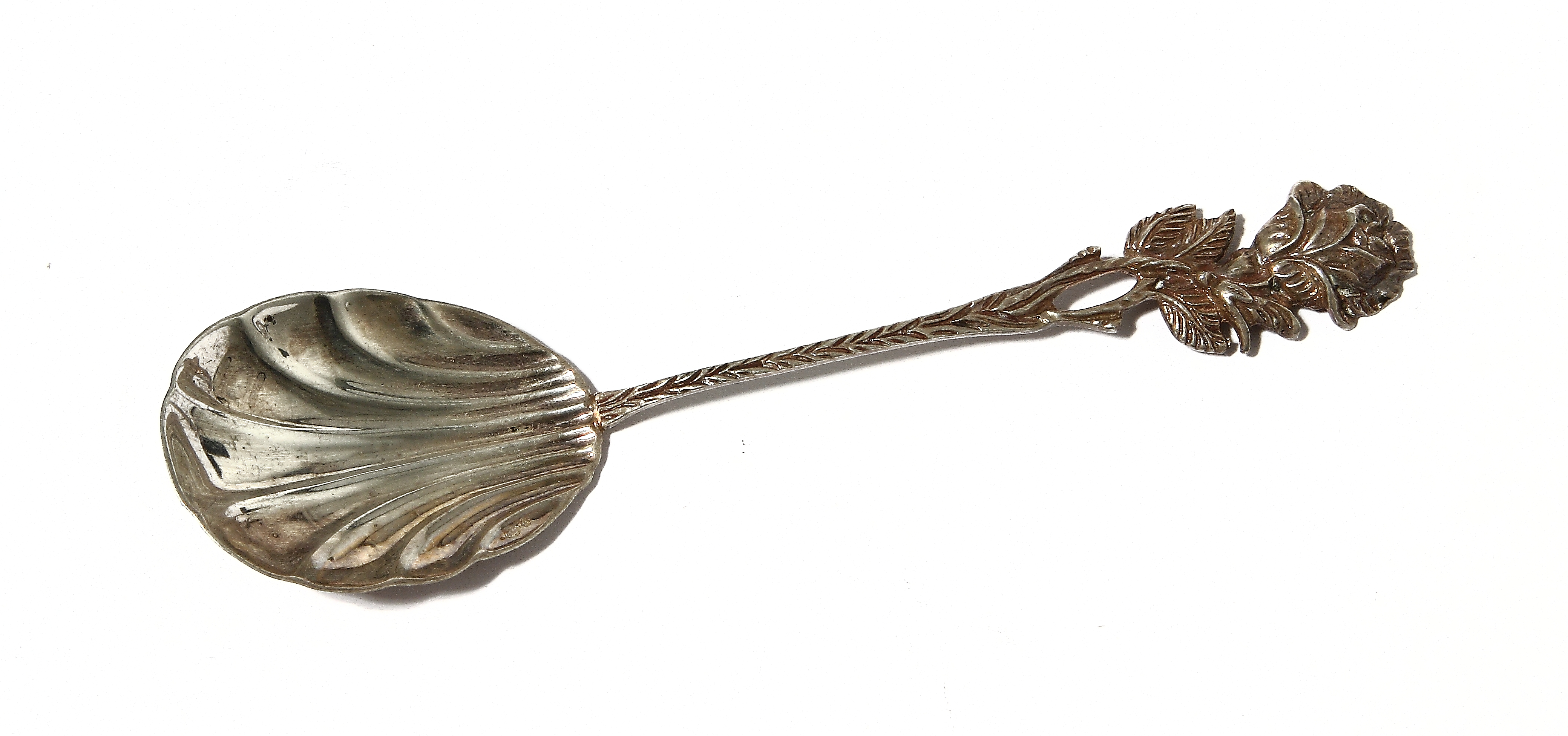 Серебряная ложка для сахара, меда, варенья или джема с черпаком-ракушкой, выполненная