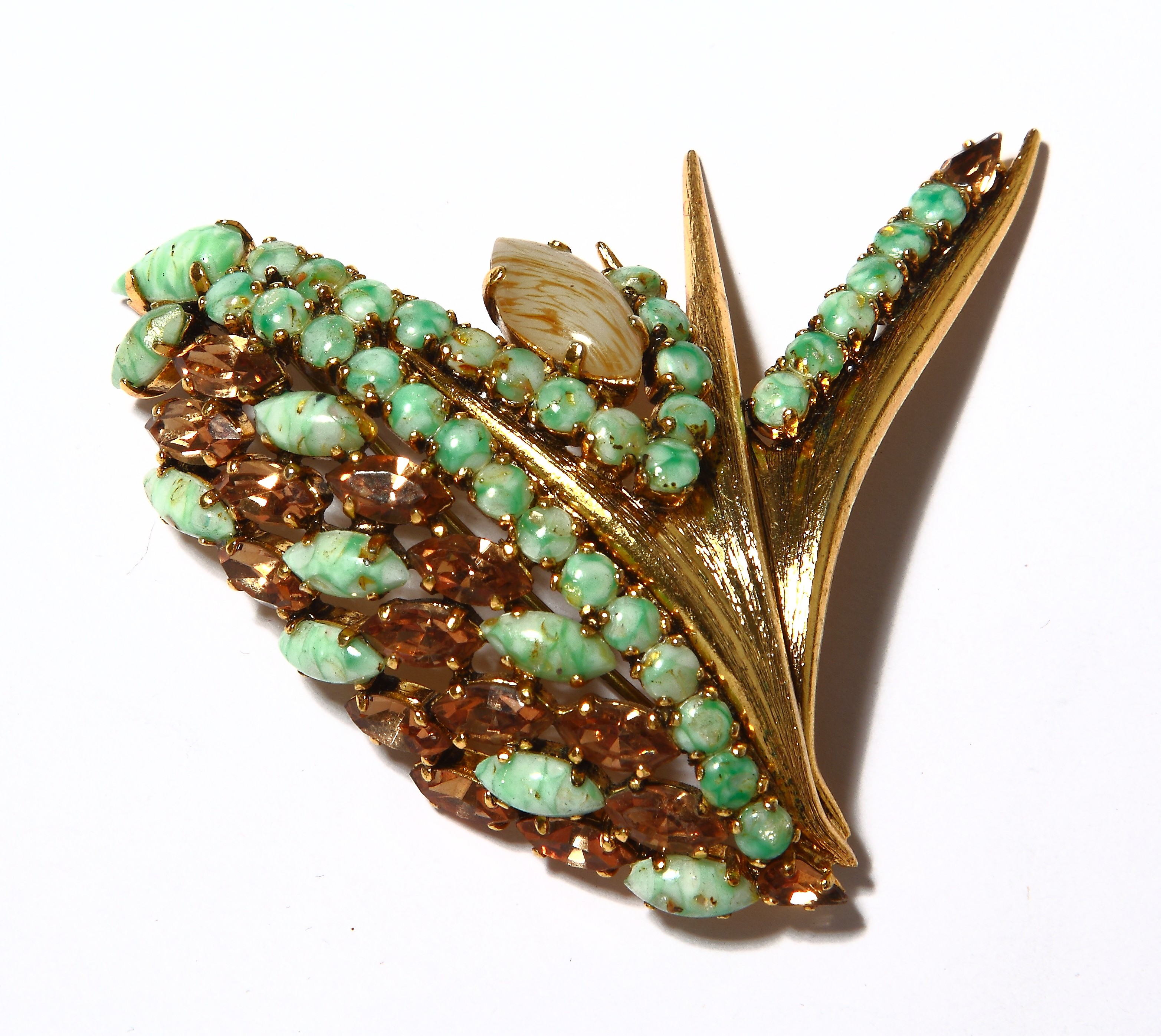Позолоченная брошь от Christian Dior. Зелено-белые камни, дымчатый хрусталь.