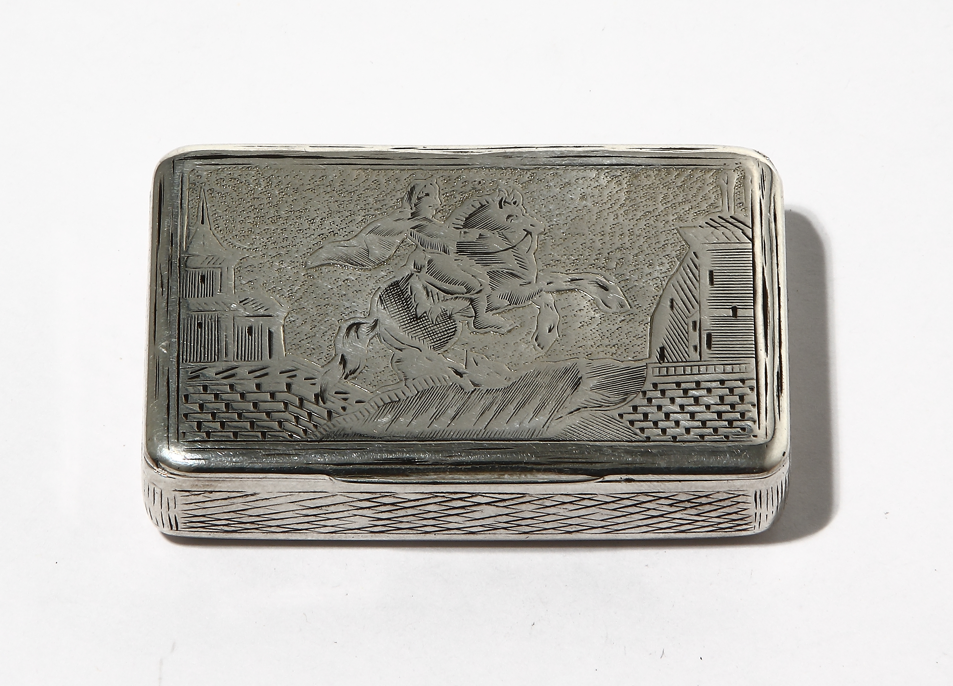Москва, 1841 год.Длина - 6,3см, ширина - 3,9см, высота - 1,3см.Вес - 58 граммов серебра золотниковой пробы (= 875 метрической пробе).
