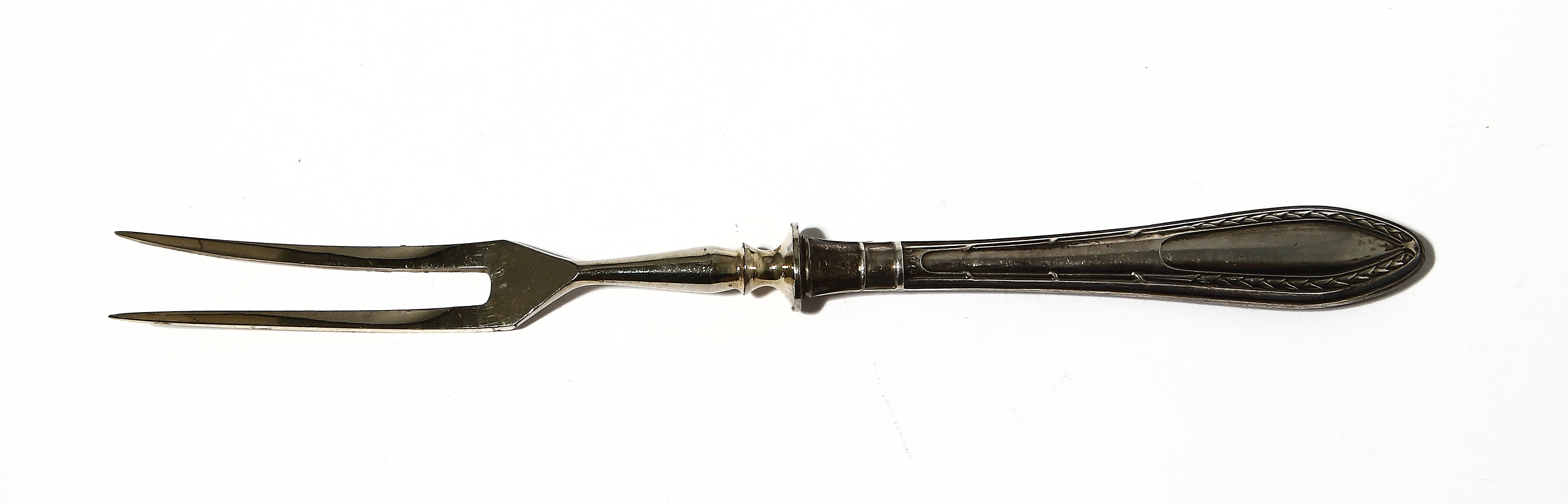 Вилка для сервировки закусок со стальной рабочей частью и серебряной ручкой.