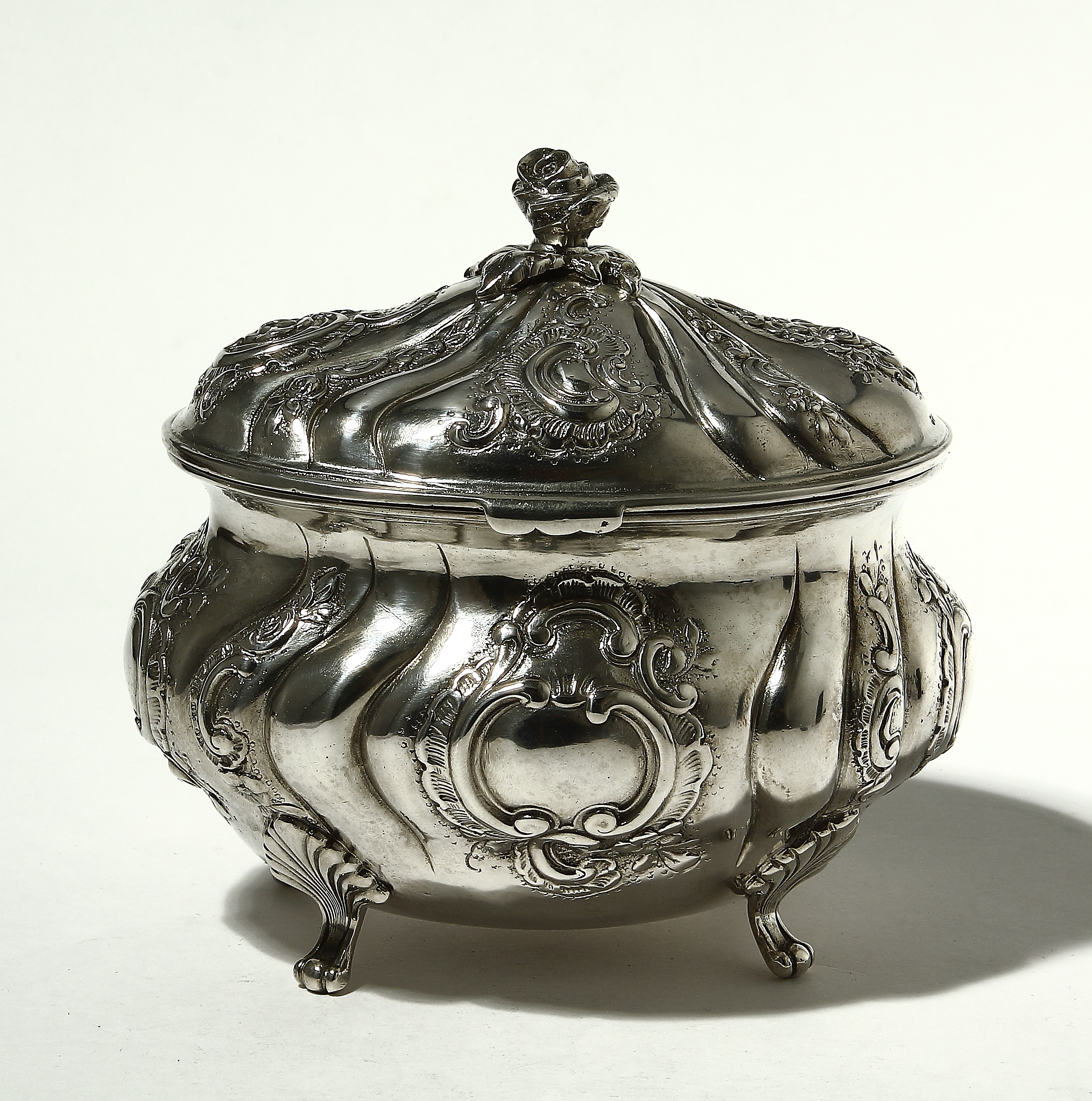 Богато декорированная серебряная сахарница или шкатулка, выполненная из толстого