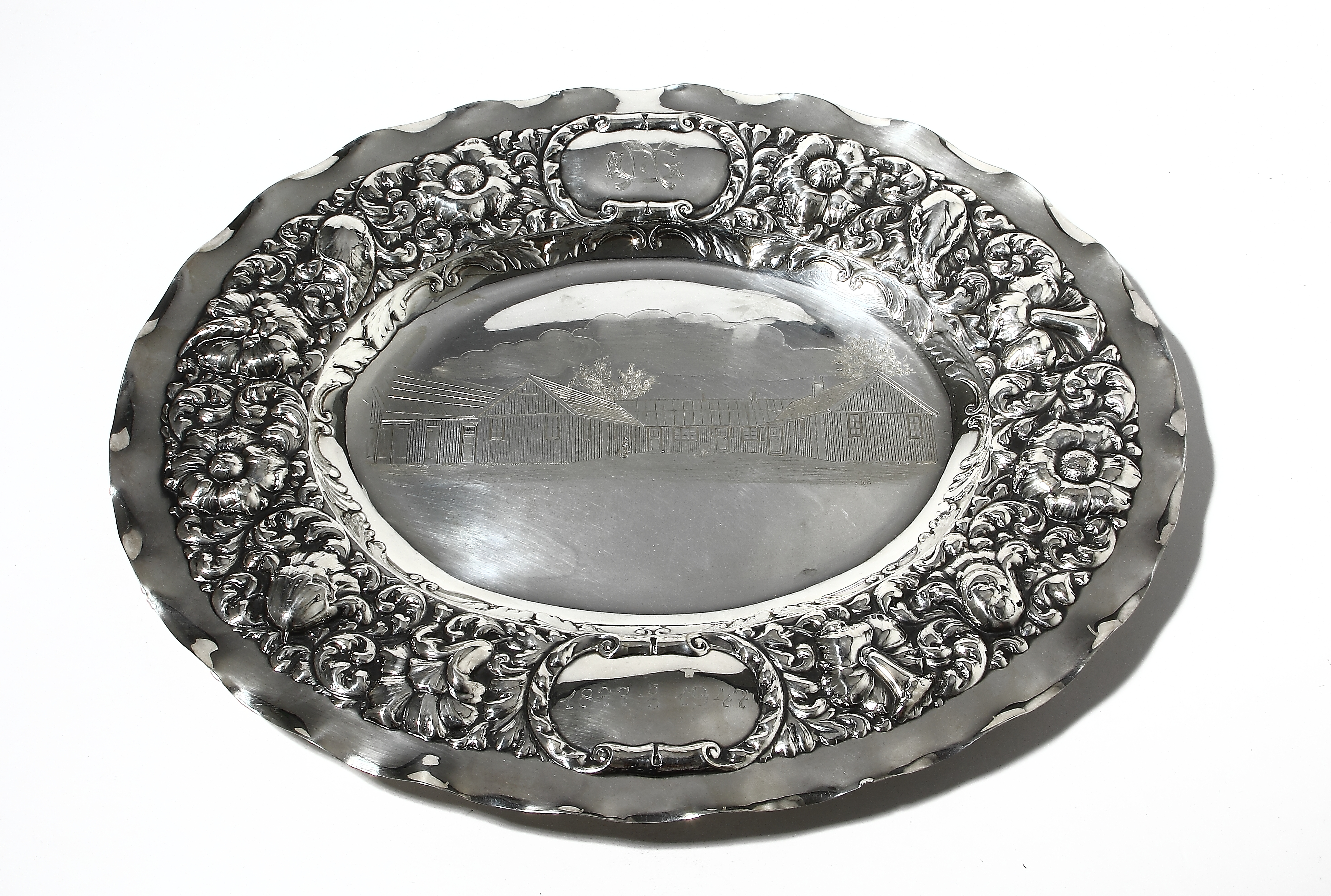 Длина - 44 см, ширина - 37 см.Вес - 735 граммов серебра 830 пробы.