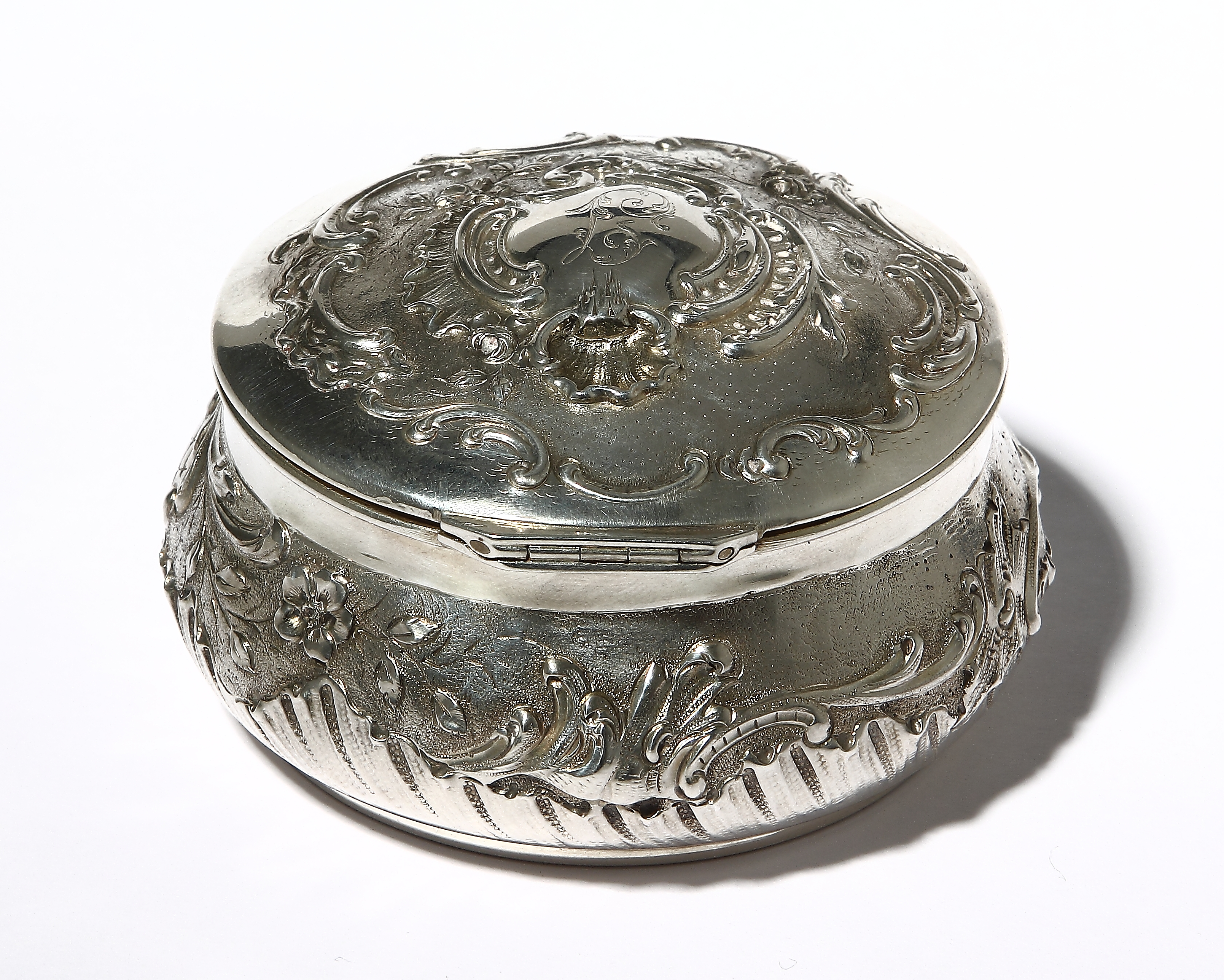 Серебряная баночка или шкатулка, богато декорированная флористическим узором.