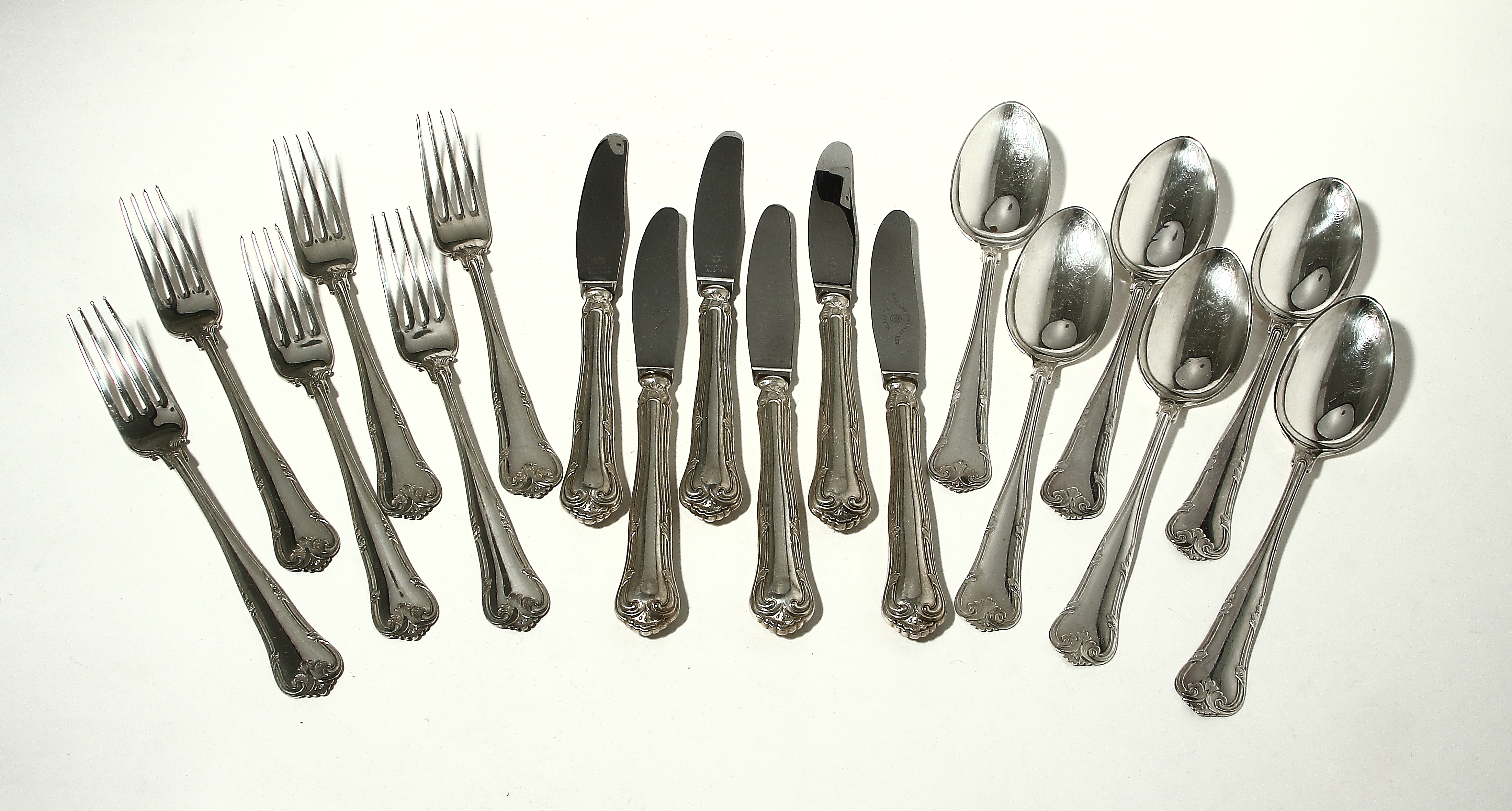 Вес полностью серебряных столовых приборов - 693 грамма серебра не ниже 826 пробы.Вес ножей с серебряными ручками, включая стальные лезвия - 488 граммов.