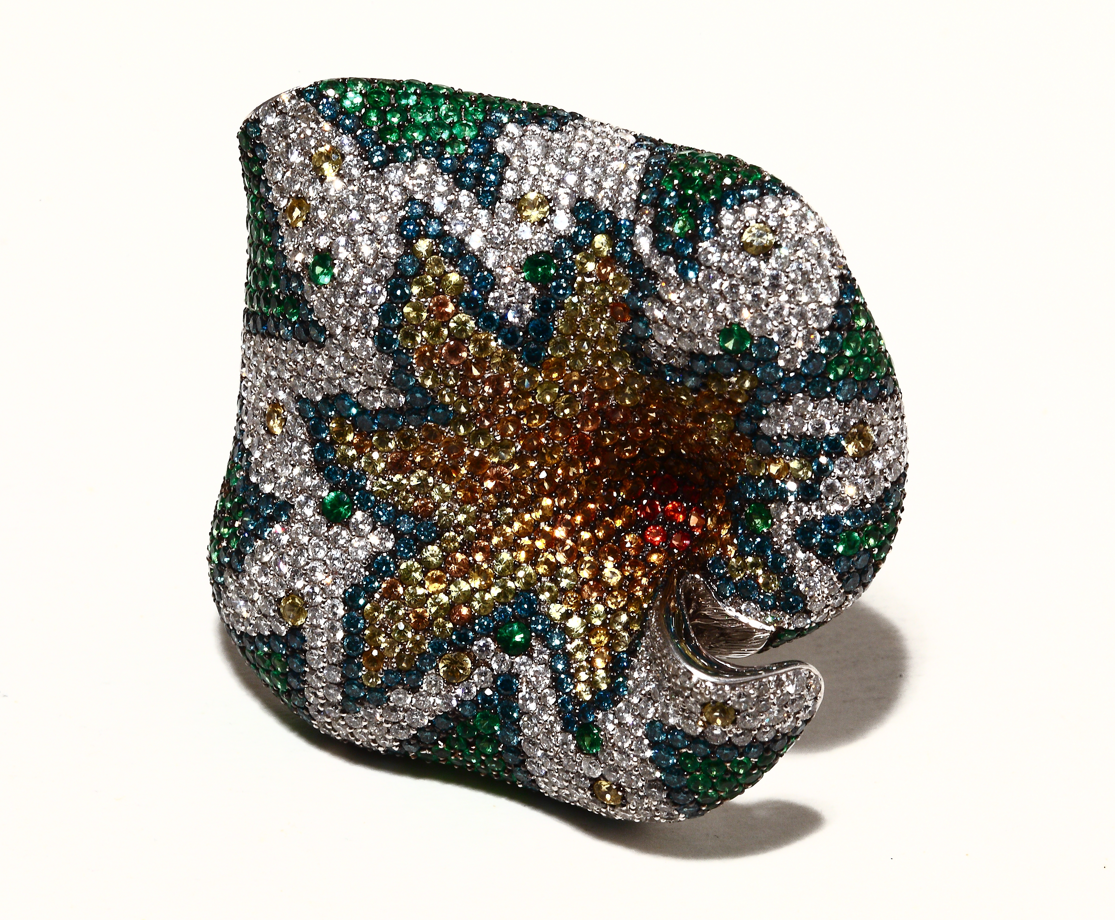 | Цавориты, сапфиры, бриллианты белые, бриллианты окрашенные. Италия, Sartoro. азмер кольца - 14,5. Максимальные размеры лицевой стороны: 4,7см х 4,4см. Вес - 45,8 граммов. Золото 750 пробы. Пробирное клеймо скрыто под наращенной дугой для уменьшения размера кольца. Кольцо может быть бесплатно увеличено до 10 размеров. Состояние смотрите на фотографиях. Если Вам что-то не видно на фотографиях, напишите, воспользовавшись опцией "Обсудить лот", выложу более подробные фотографии.   Кликнув по ниже указанным картинкам, Вы сможете рассмотреть лот на более качественных фотографиях, чем это позволяет сделать "Молоток":