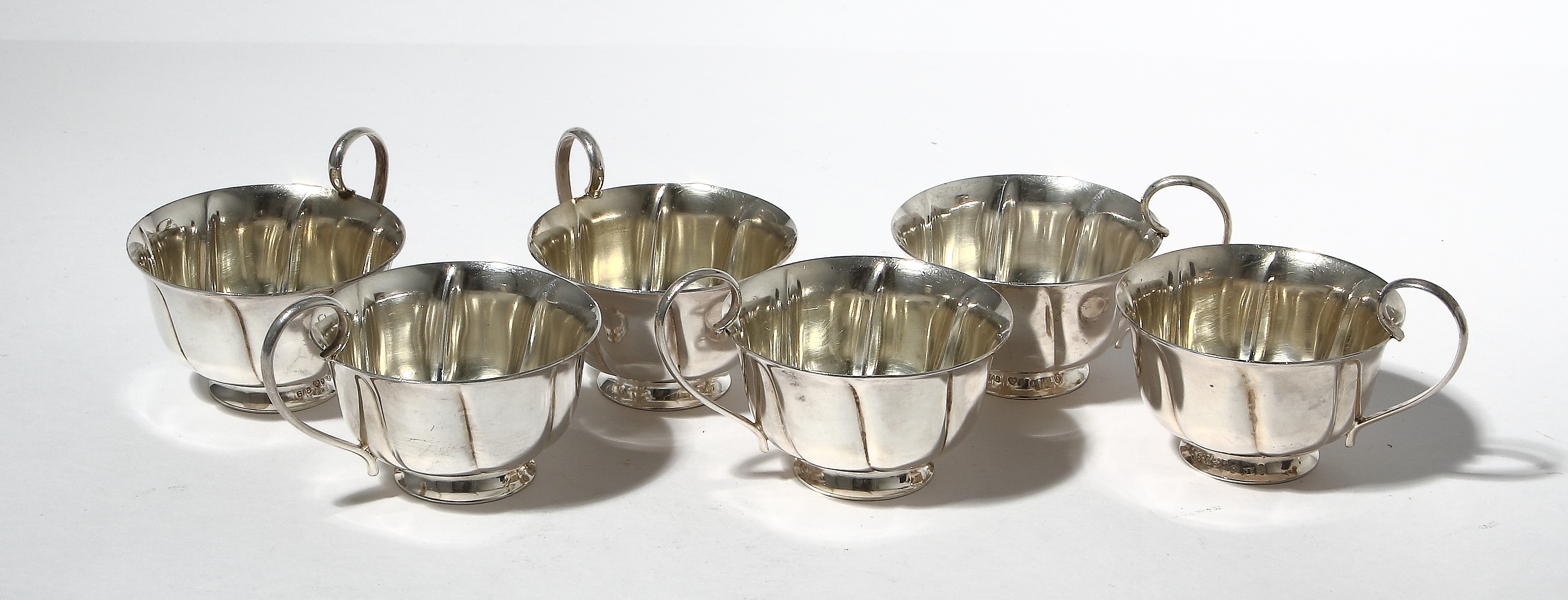 Комплект из шести серебряных рюмочек с боковыми ручками для ликера, пунша и других
