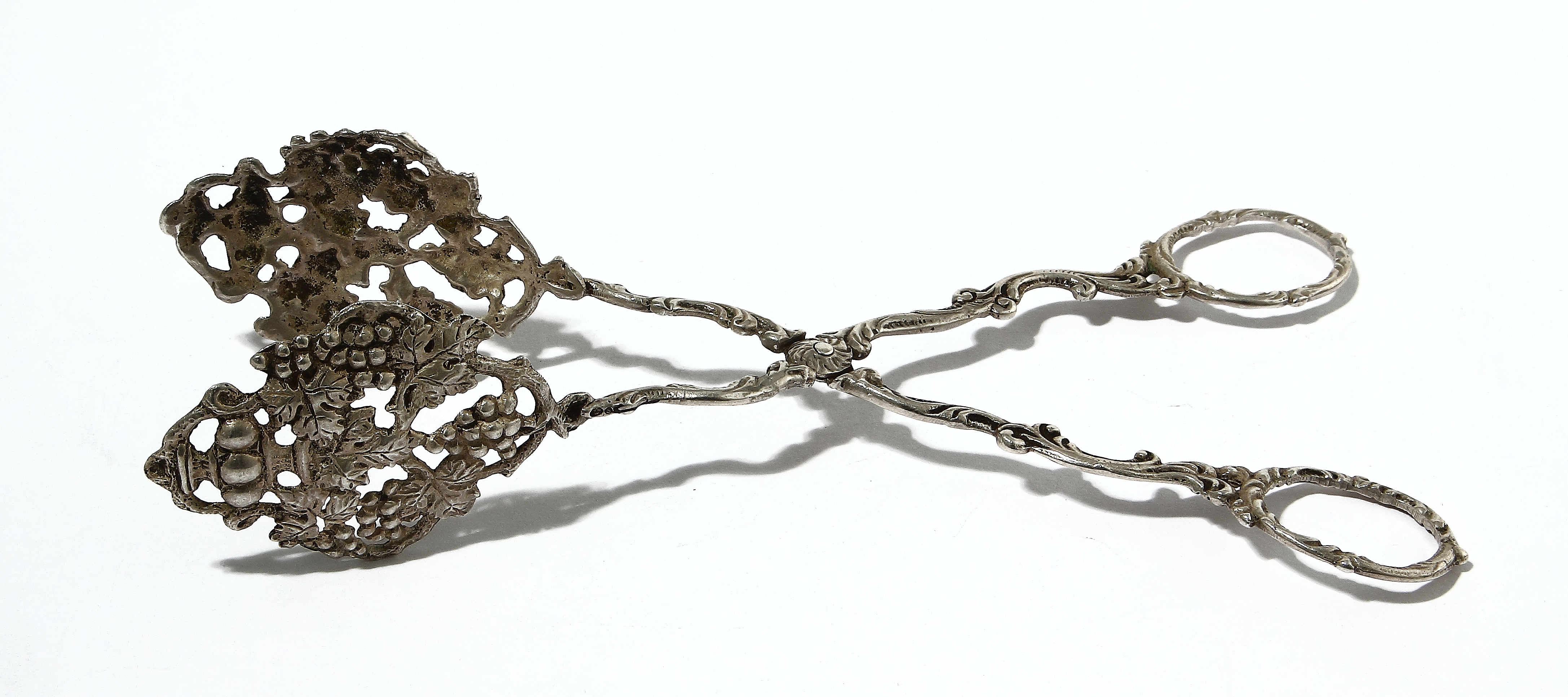 Серебряные кондитерские щипцы, декорированные прорезной лозой с виноградными гроздьями.