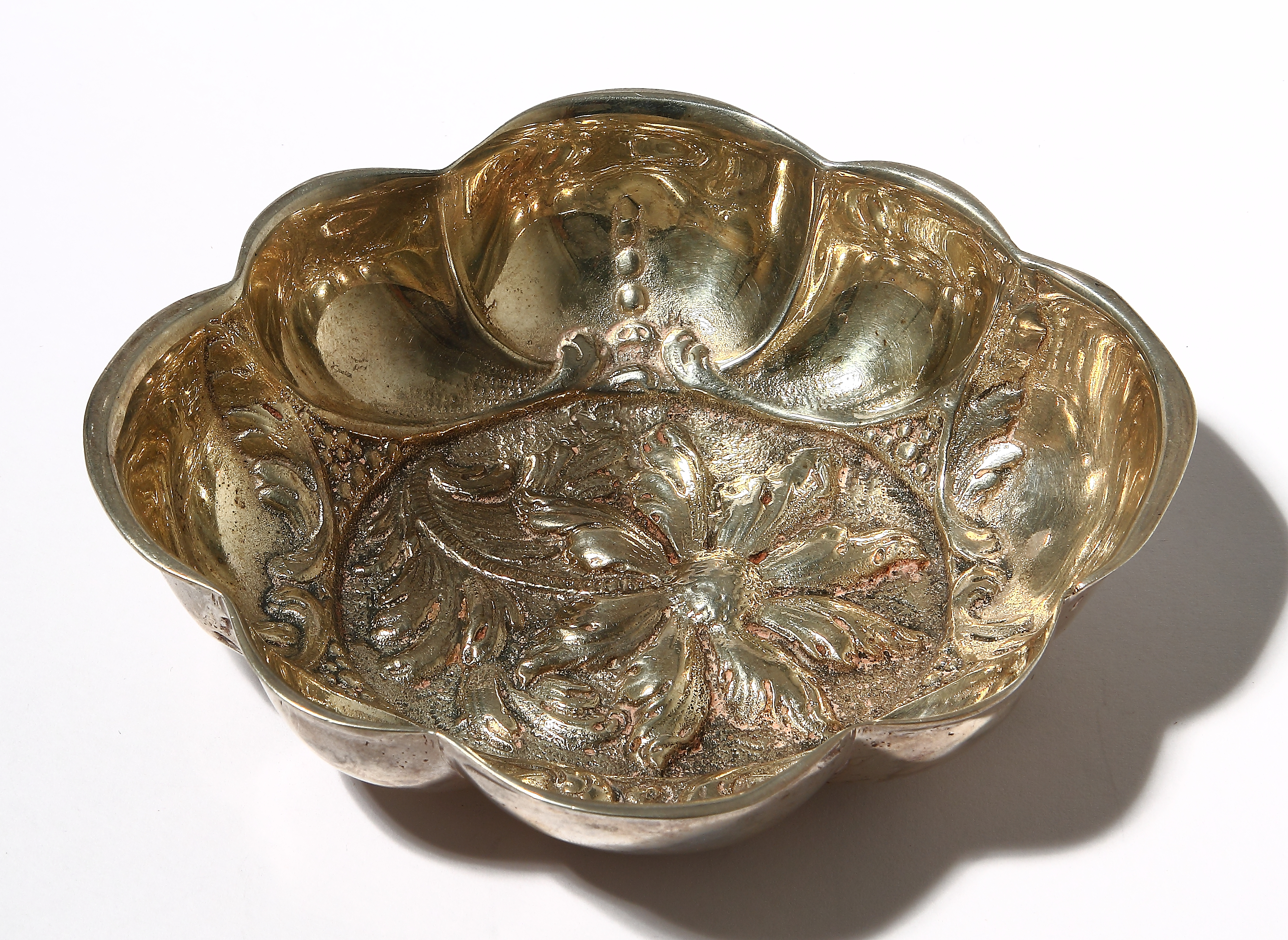 Массивная серебряная вазочка с фигурными краями и крупным рельефным цветком на дне.