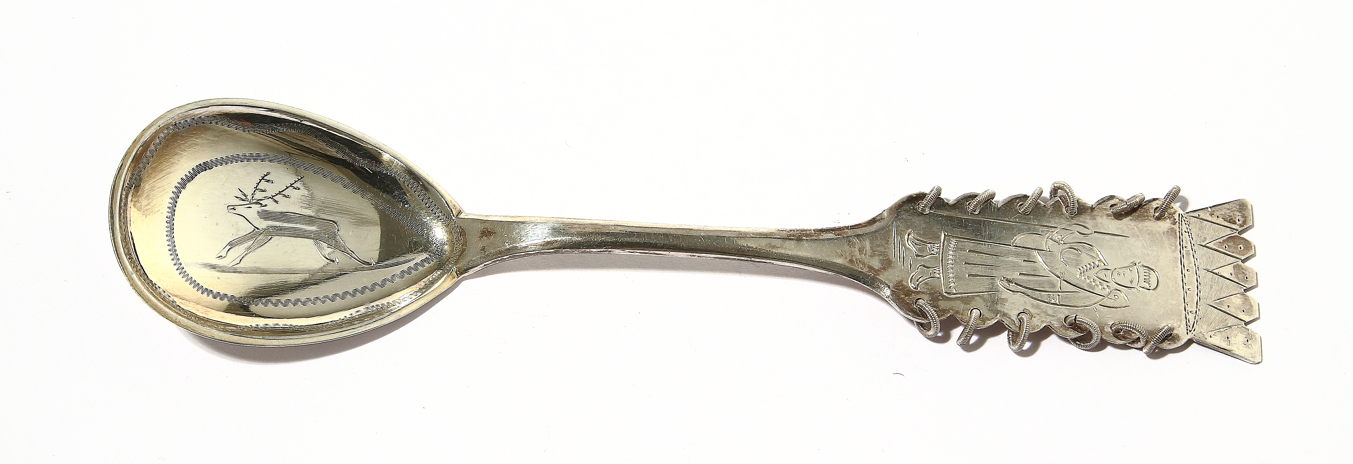 Серебряная десертная ложка, декорированная образами оленя и лапландца