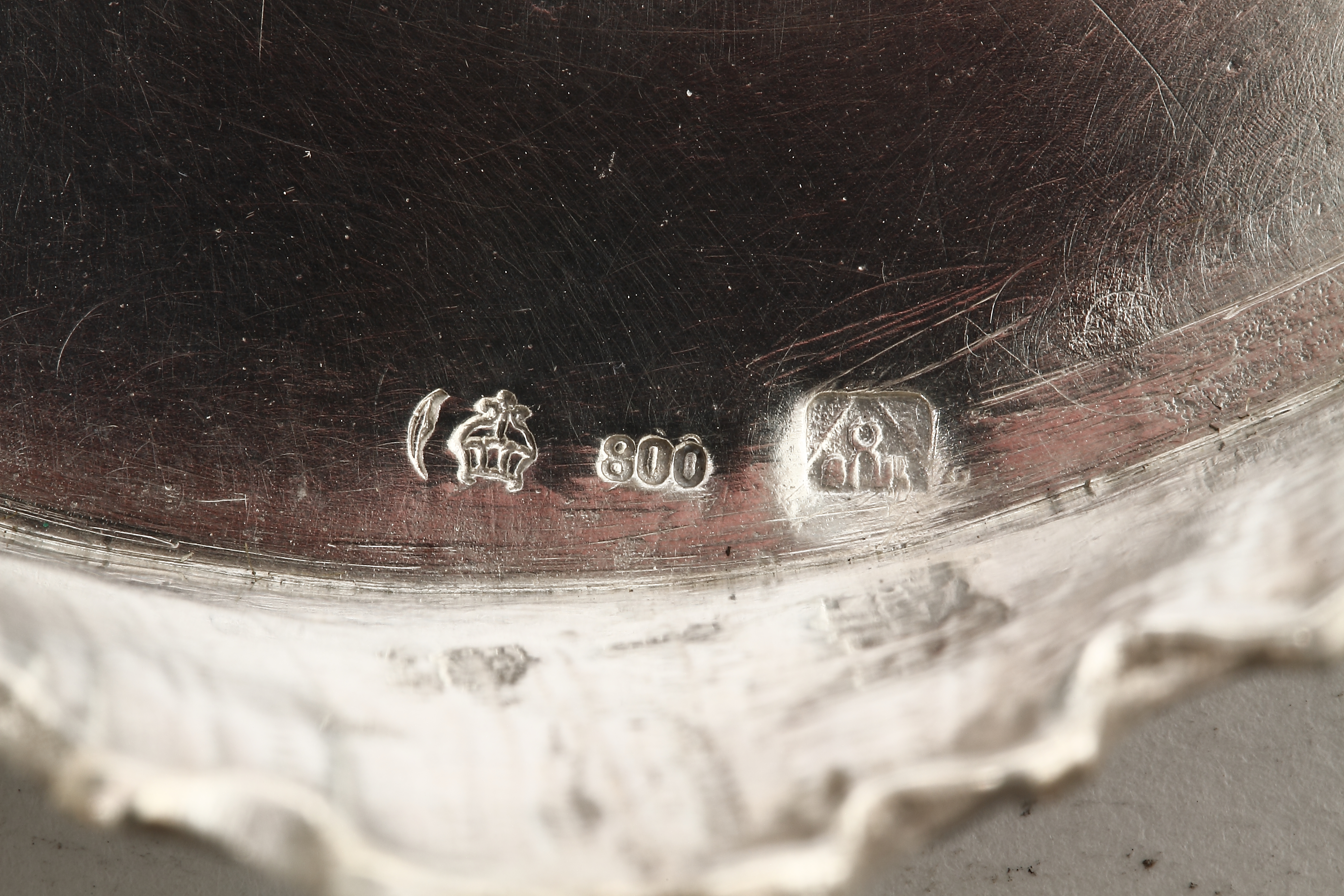 Пробирные клейма Германии:«Полумесяц и корона» - клеймо, удостоверяющее, что изделие было изготовлено в Германии из серебра.«800» - цифровое клеймо, удостоверяющее 800 пробу серебра.