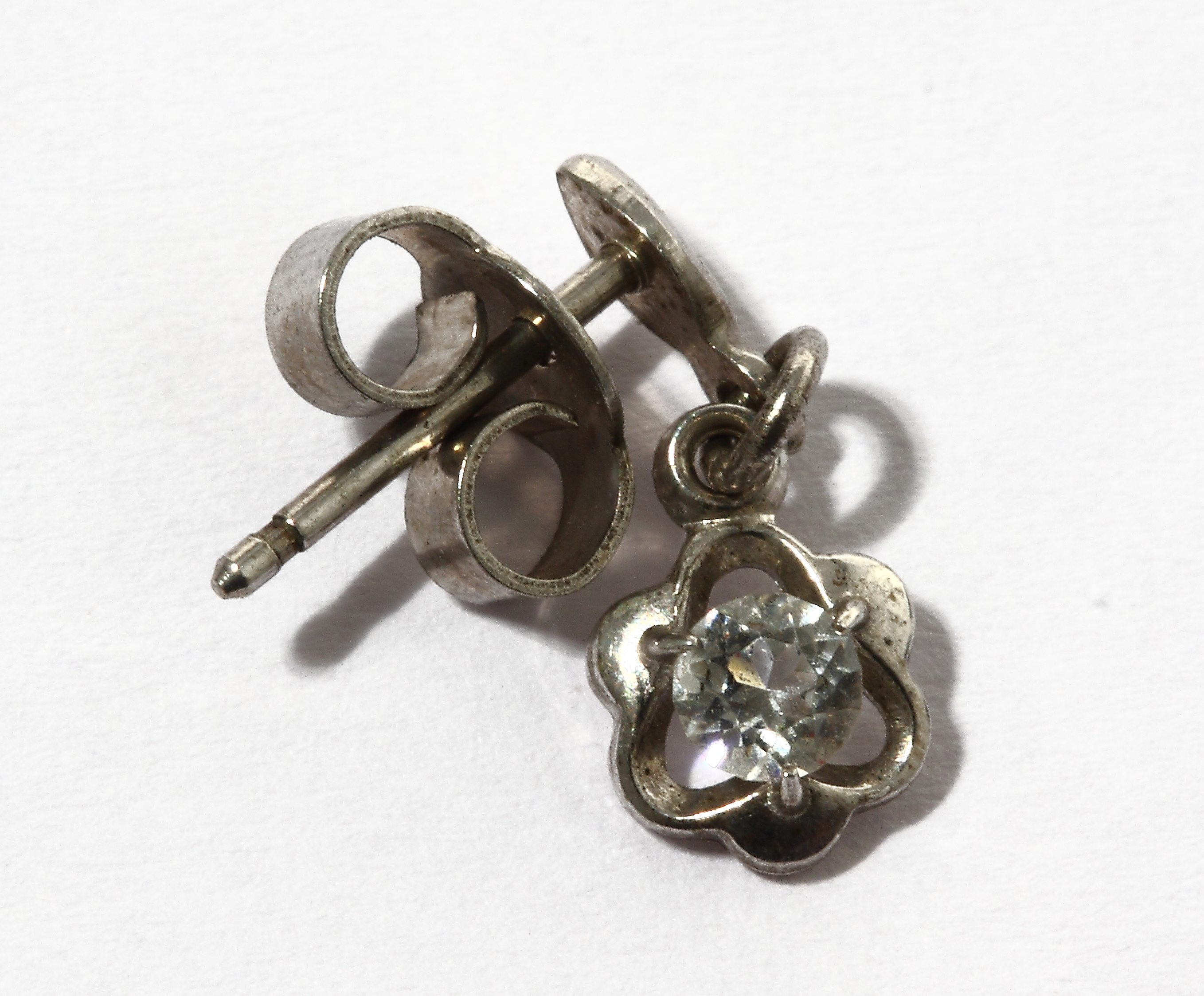 Серебряная сережка в виде цветочка с белым прозрачным камушком.